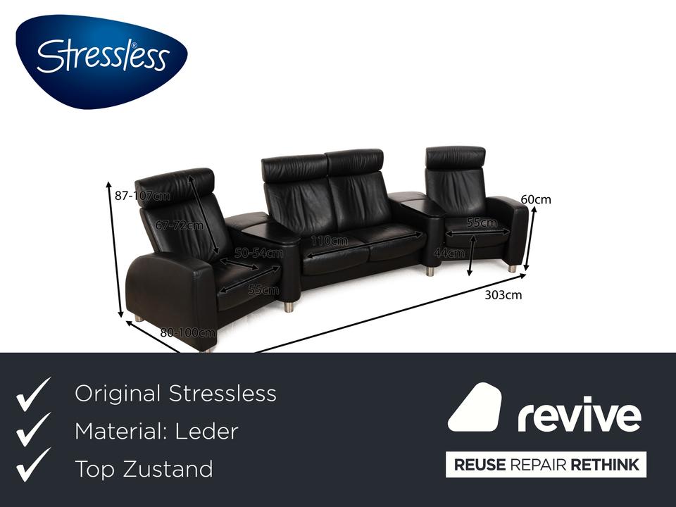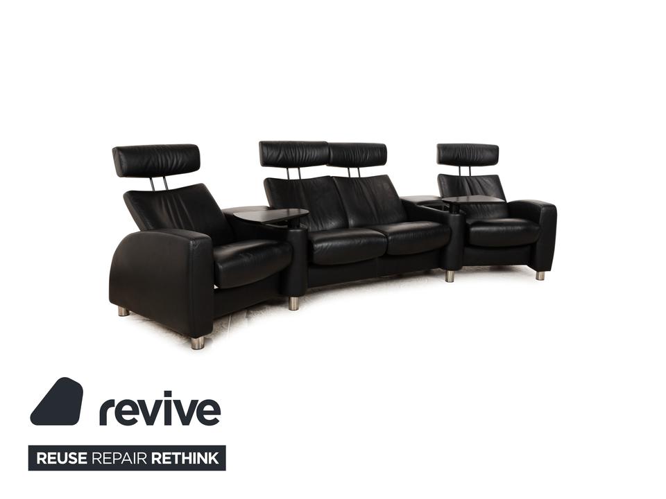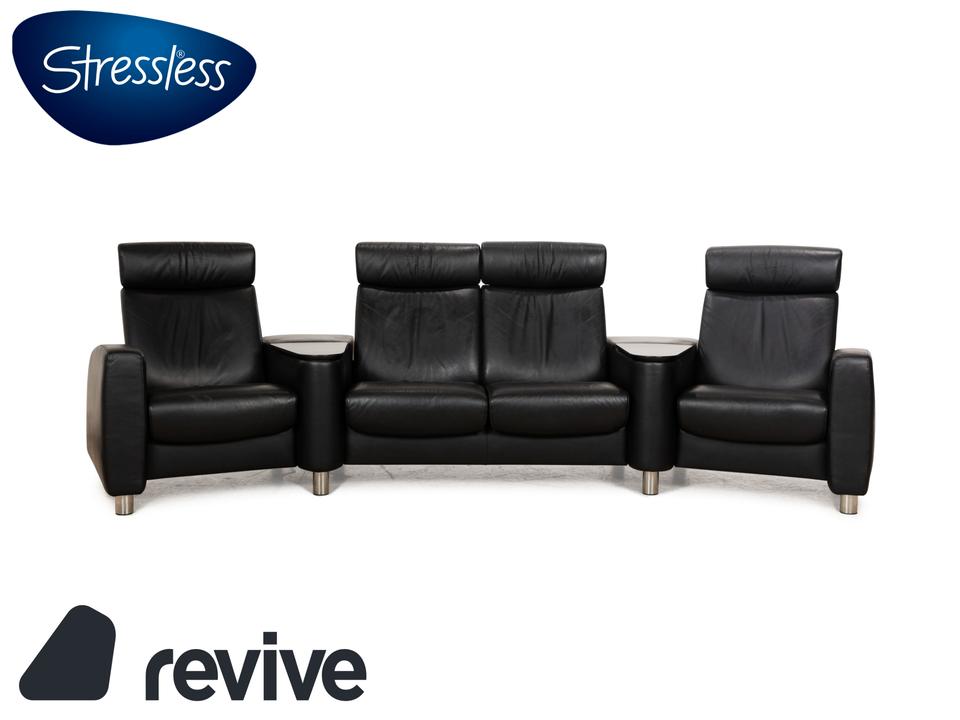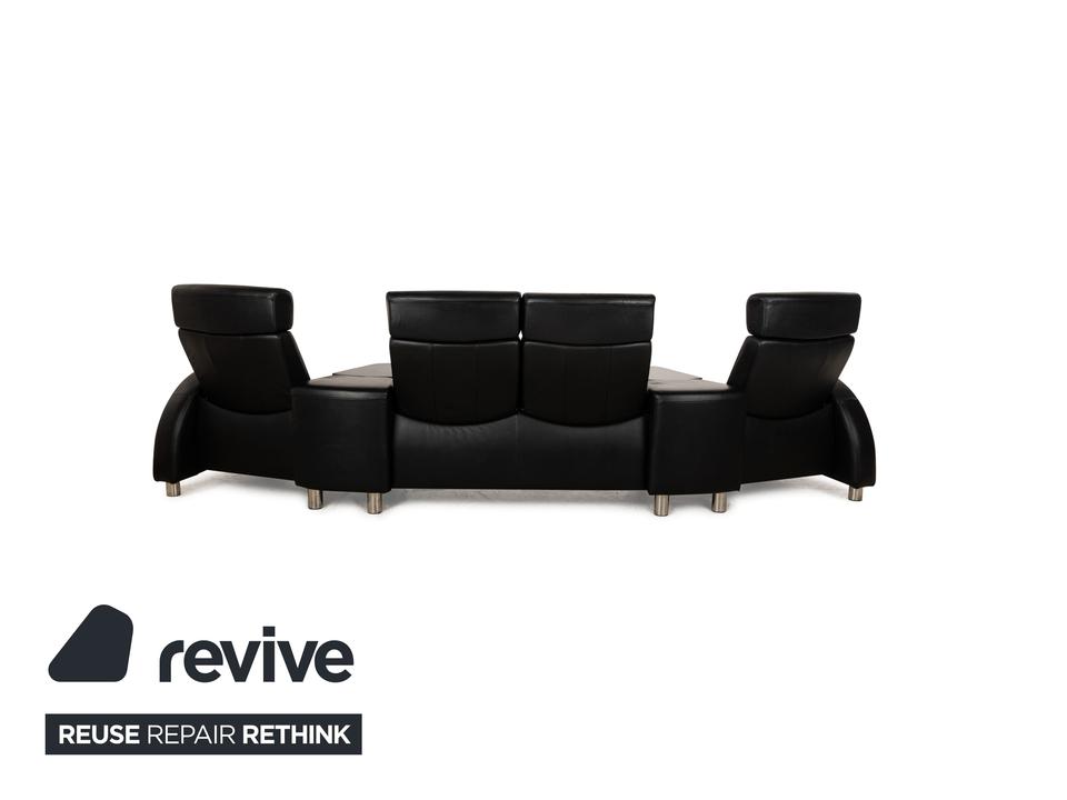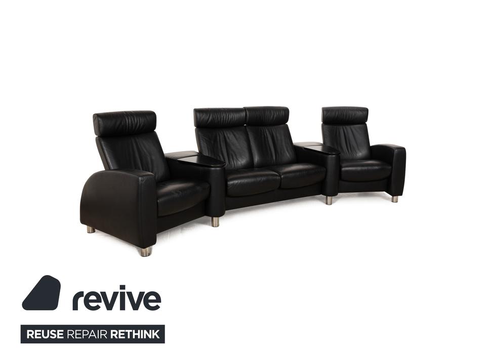 Der Viersitzer Arion von Stressless ist mit schwarzem Leder bezogen und steht auf runden Füßen aus Metall. Er zeichnet sich durch die komfortable Relaxfunktion und die verstellbaren Holzablagen mit integriertem Stauraum aus. Verstellbare Kopfstützen sorgen für erhöhten Komfort.