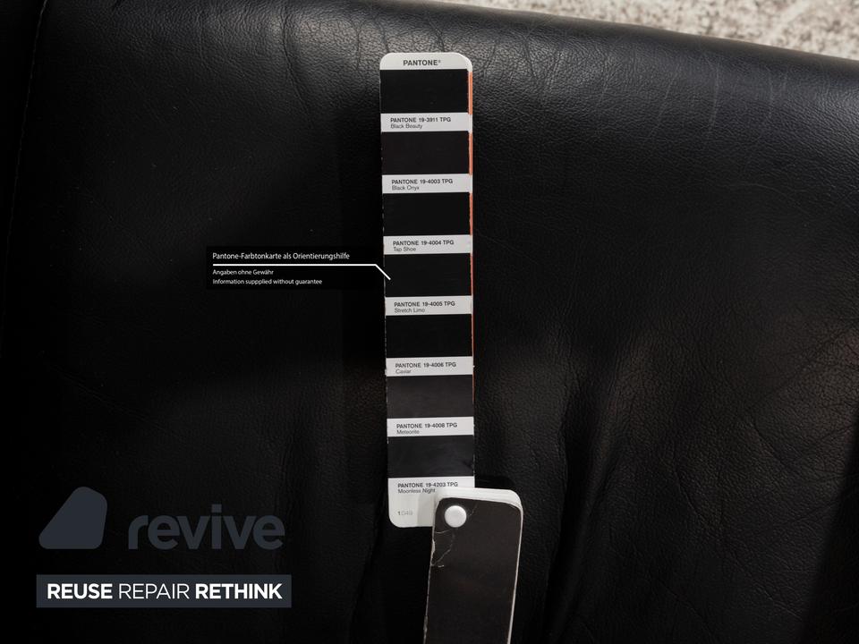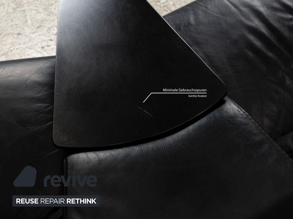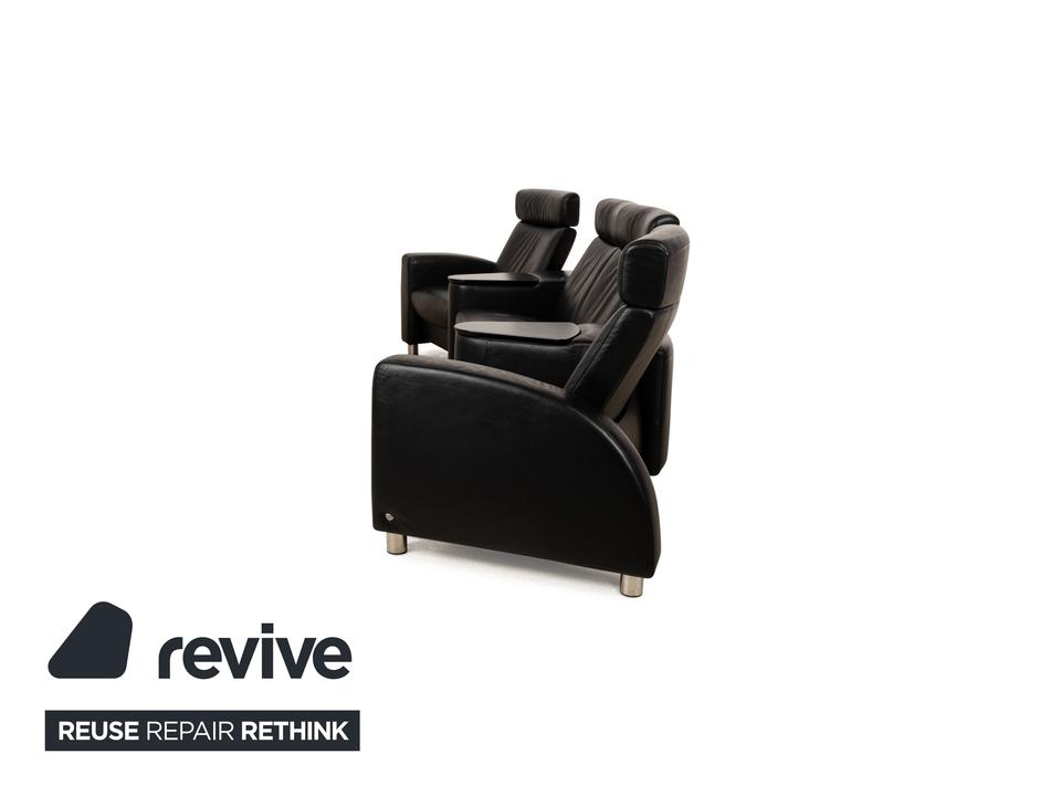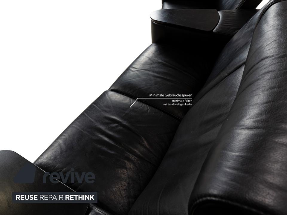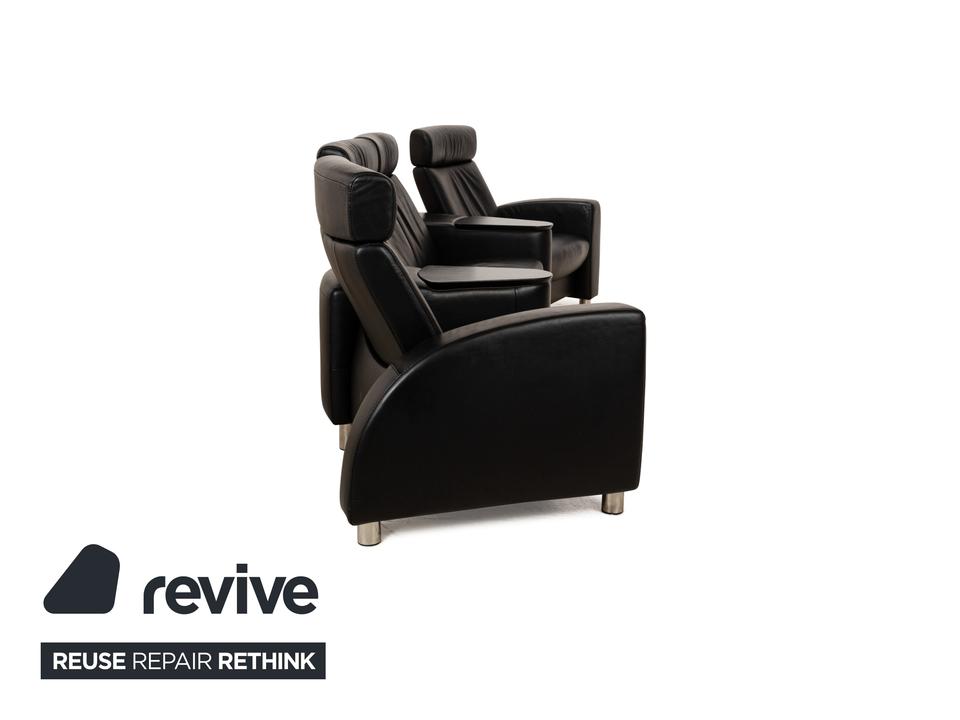 Der Viersitzer Arion von Stressless ist mit schwarzem Leder bezogen und steht auf runden Füßen aus Metall. Er zeichnet sich durch die komfortable Relaxfunktion und die verstellbaren Holzablagen mit integriertem Stauraum aus. Verstellbare Kopfstützen sorgen für erhöhten Komfort.