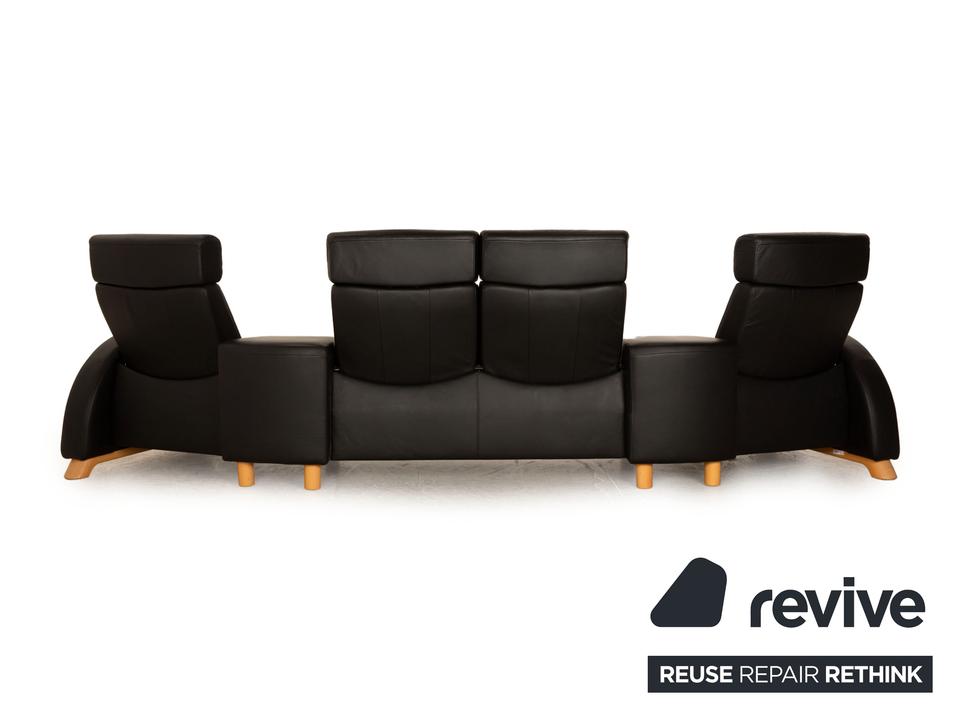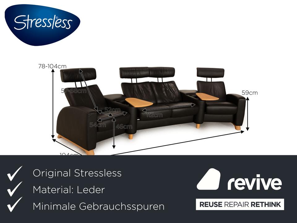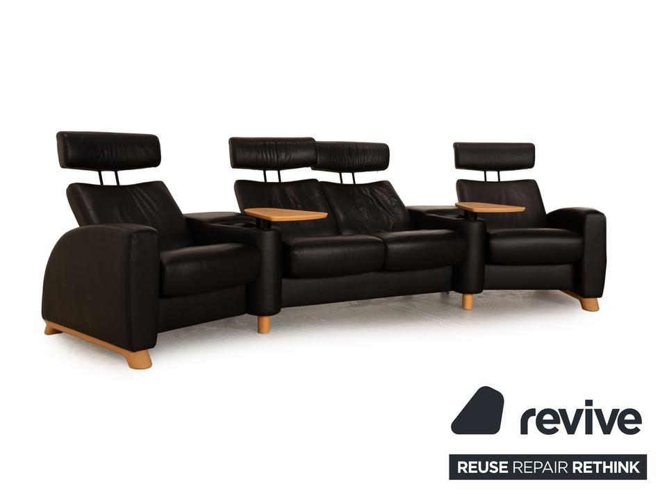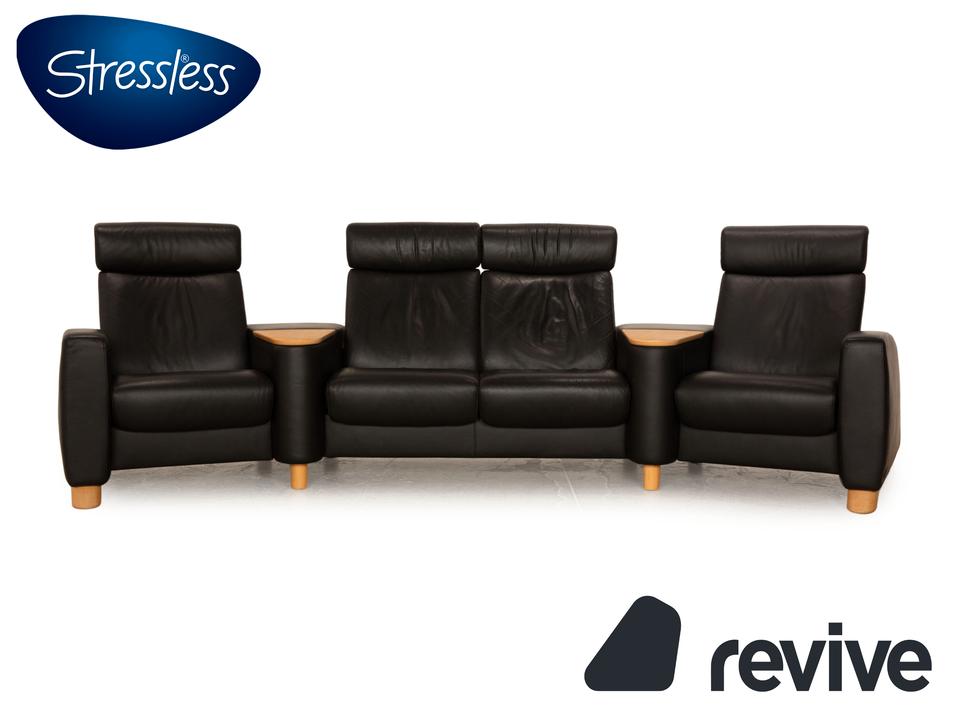 Das Arion Sofa von Stressless ist mit einem schwarzen Echtleder bezogen und steht auf Holzfüßen. Das klassische Design und die praktischen Ablagen zeichnen den Viersitzer aus.