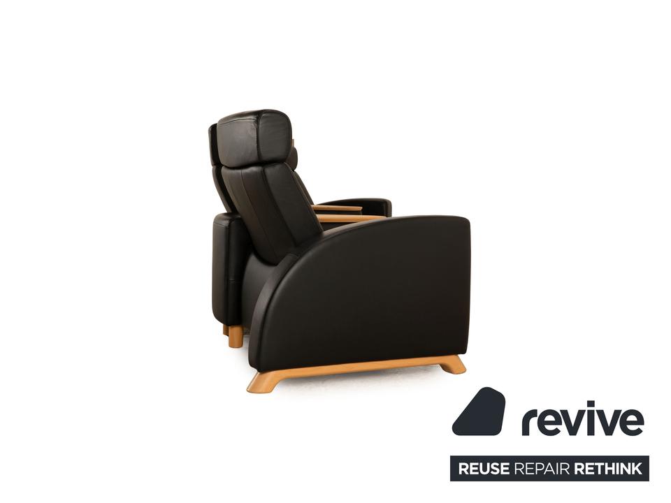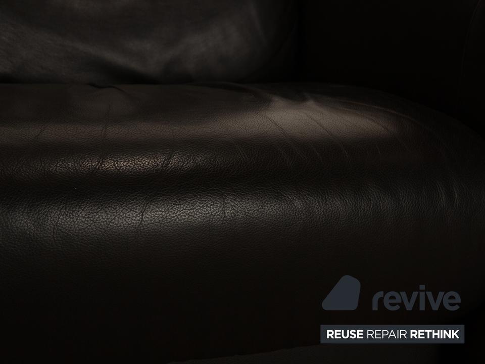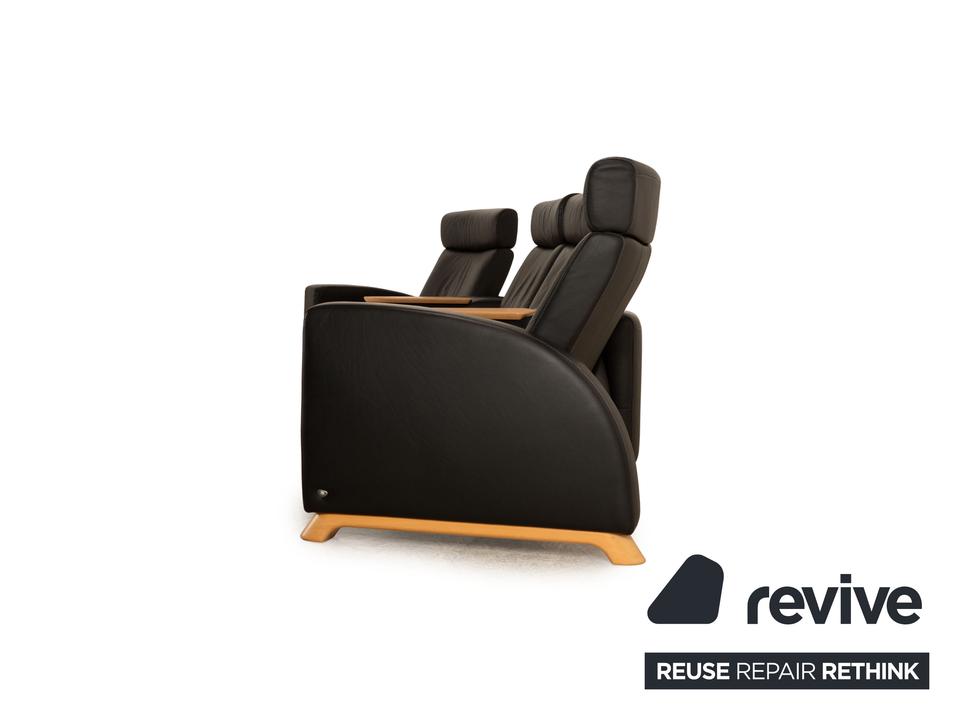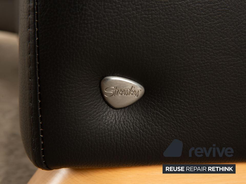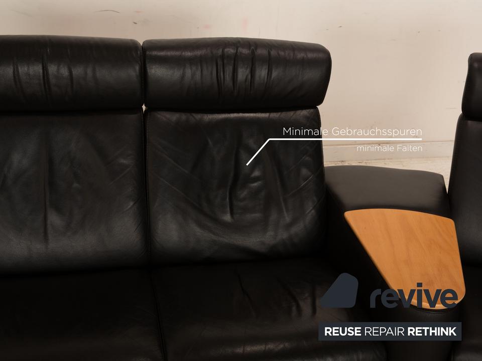 Das Arion Sofa von Stressless ist mit einem schwarzen Echtleder bezogen und steht auf Holzfüßen. Das klassische Design und die praktischen Ablagen zeichnen den Viersitzer aus.