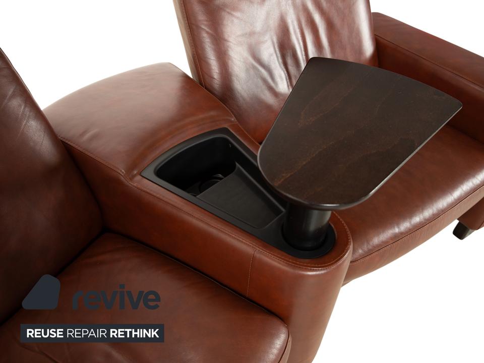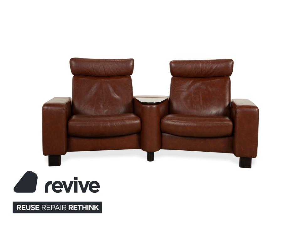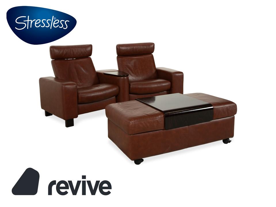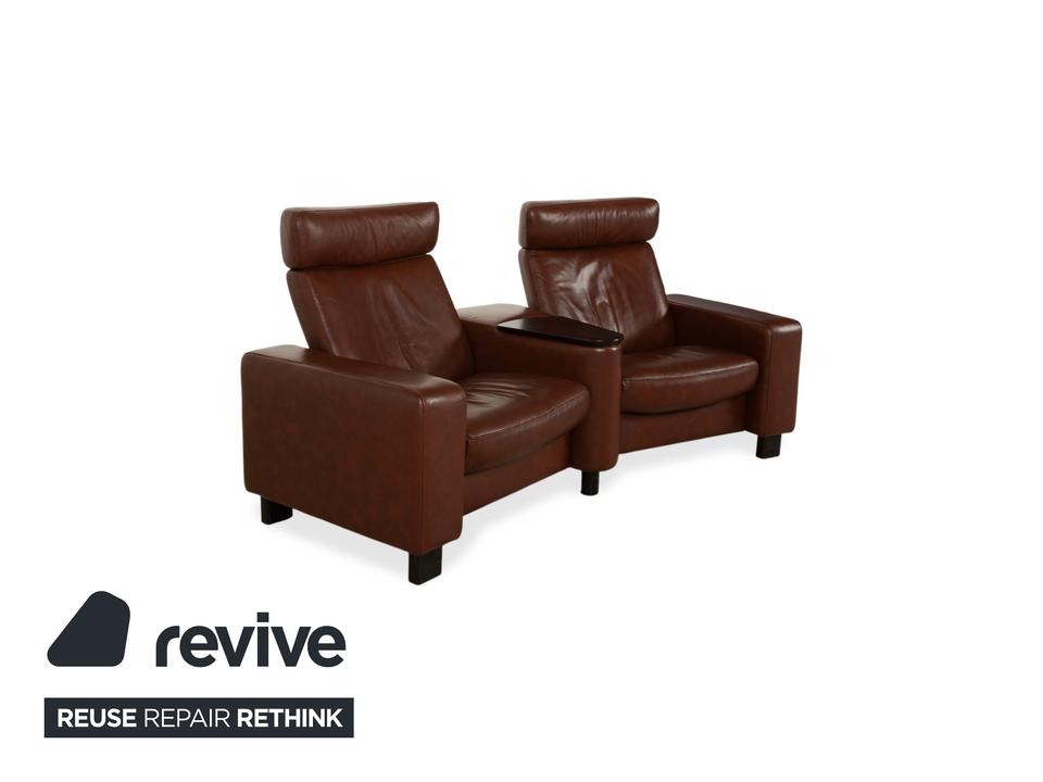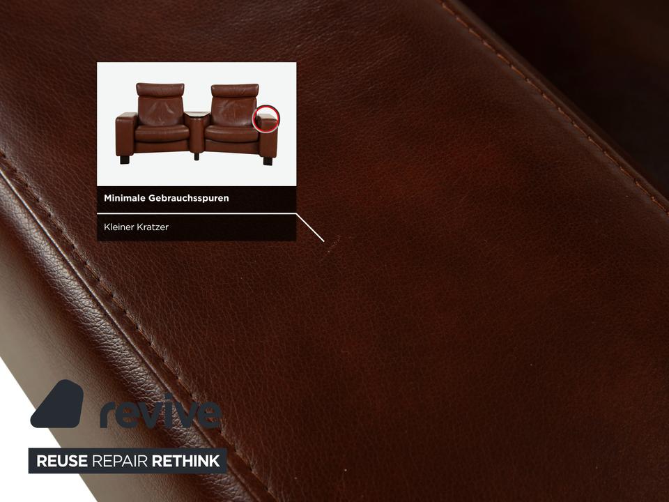 Hier holst du dir mit der Kombination aus dem Stressless Arion Zweisitzer und dem passenden Multifunktions-Hocker das ultimative Heimkino-Erlebnis direkt in dein Wohnzimmer. In edlem, warmem braunem Leder gefertigt, vereint dieses Set skandinavisches Design mit dem weltweit geschätzten Stressless-Komfort. Uns fasziniert besonders die durchdachte Trapez-Konfiguration des Zweisitzers: Zwischen den beiden Sitzen befindet sich eine praktische Mittelkonsole mit integrierter Holzablage, die ideal als Tisch für Getränke oder Snacks dient. Dank der manuellen Relaxfunktion lassen sich beide Sitze unabhängig voneinander durch Körperdruck in eine entspannte Liegeposition bringen. Die hohen Rückenlehnen mit den markanten, verstellbaren Kopfstützen sorgen dabei für eine perfekte ergonomische Unterstützung deines Nackens und Rückens.Der großzügige Hocker rundet das Ensemble perfekt ab: Er ist weit mehr als nur eine Fußablage. Mit seinem integrierten, abnehmbaren Holz-Tablett verwandelt er sich im Handumdrehen in einen Beistelltisch. Dank der Rollen bleibt er dabei stets flexibel positionierbar.