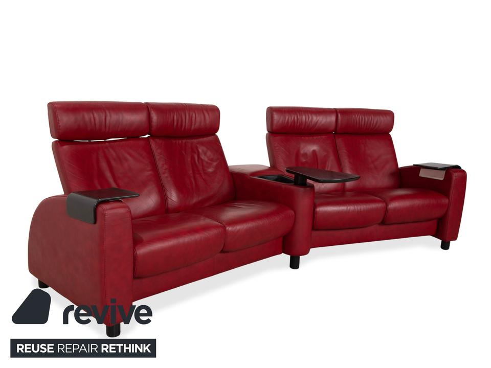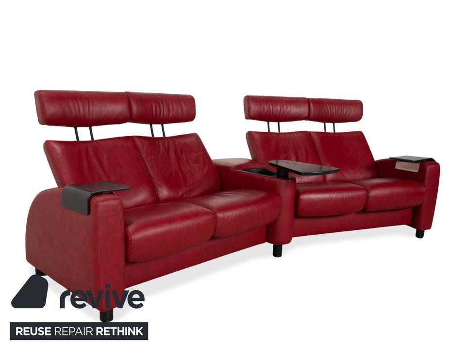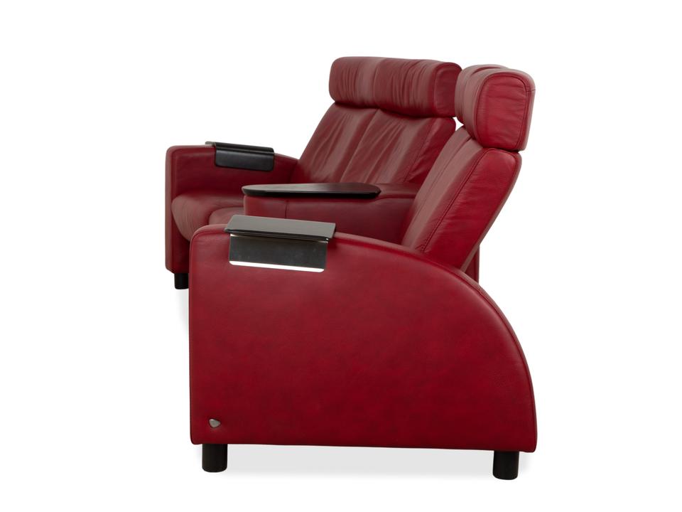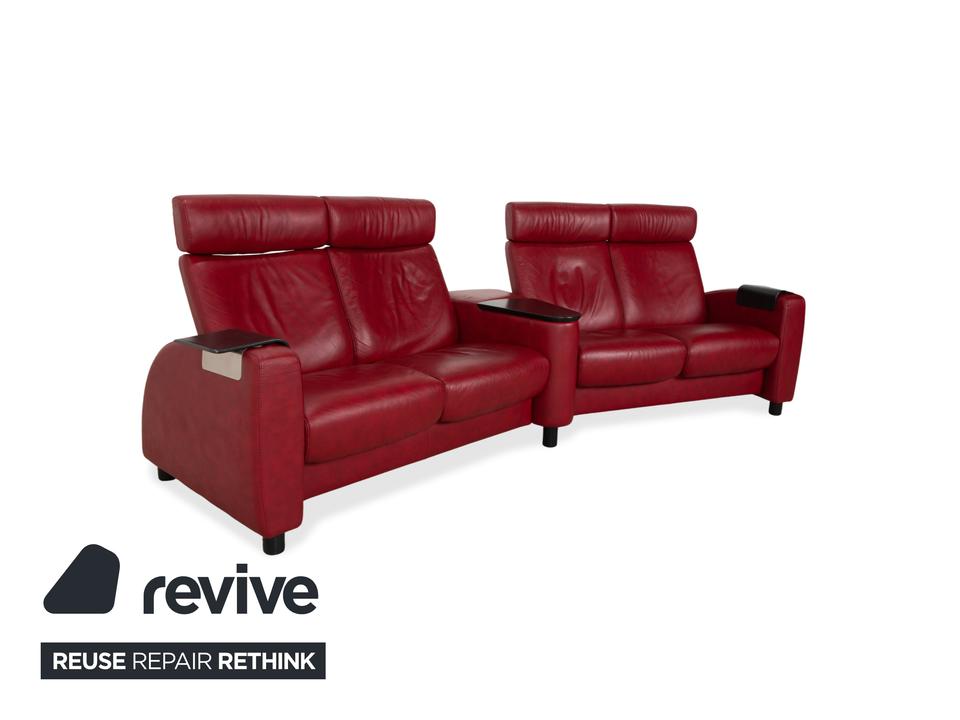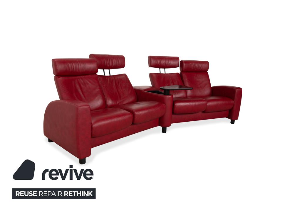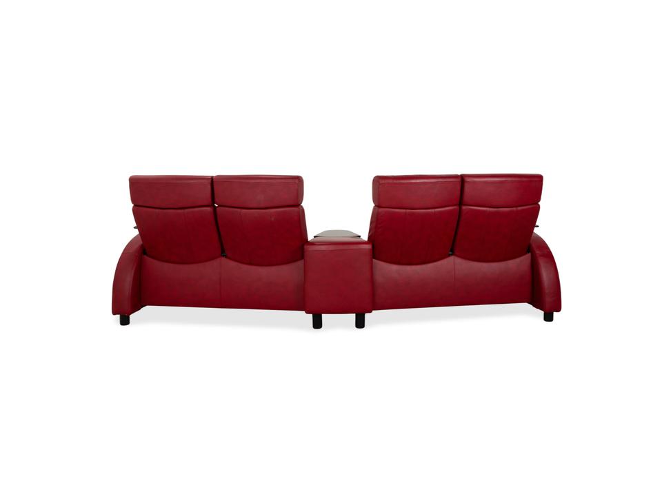 Mit diesem Viersitzer aus der Stressless „Arion“ Serie holst du dir das ultimative Heimkino-Erlebnis in dein Wohnzimmer. Die Kombination aus vier Sitzplätzen, die durch eine praktische Mittelkonsole verbunden sind, macht dieses Sofa zum perfekten Treffpunkt für entspannte Abende mit der Familie oder Freunden.Jeder Sitz ist mit der bewährten Stressless-Gleitfunktion ausgestattet, die sich sanft deinen Körperbewegungen anpasst – so findet jeder seine individuelle Lieblingsposition. Die hohen Rückenlehnen (Highback) sorgen für optimale Unterstützung von Kopf und Nacken, was besonders bei langen Filmen Gold wert ist. Das rote Leder setzt dabei einen kräftigen, warmen Akzent im Raum, während die integrierte Ablagefläche in der Mitte Platz für Getränke und Snacks bietet. Luxus, Komfort und Funktionalität in einem beeindruckenden Möbelstück.