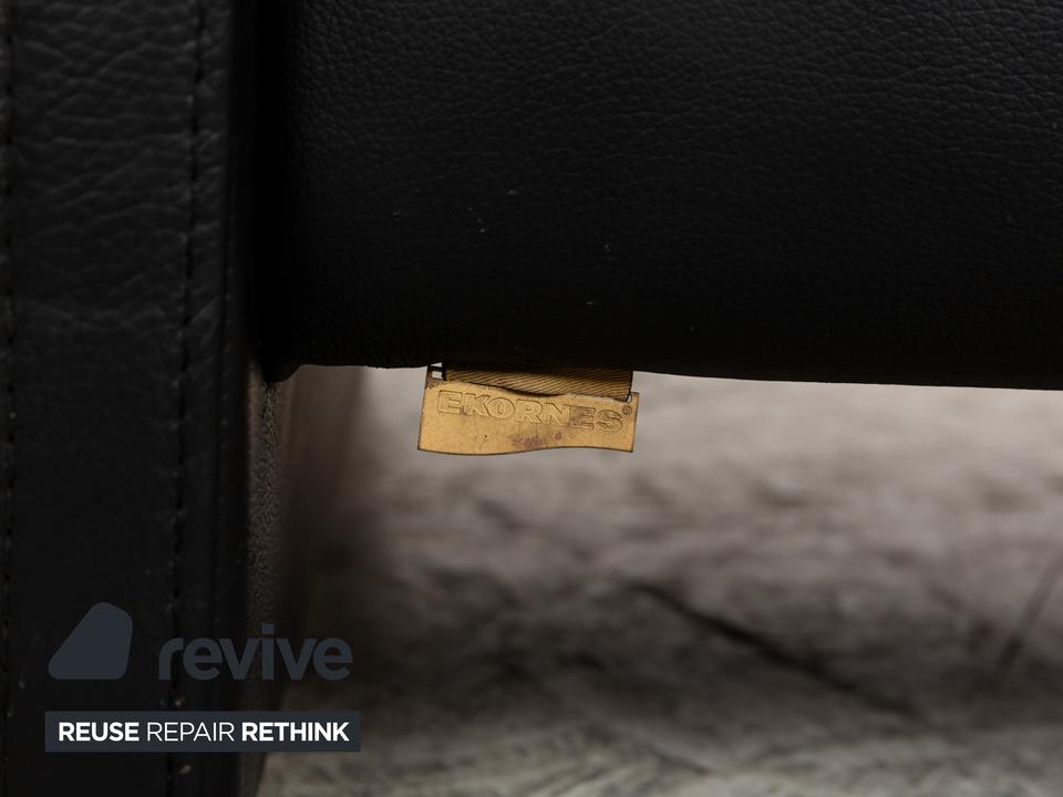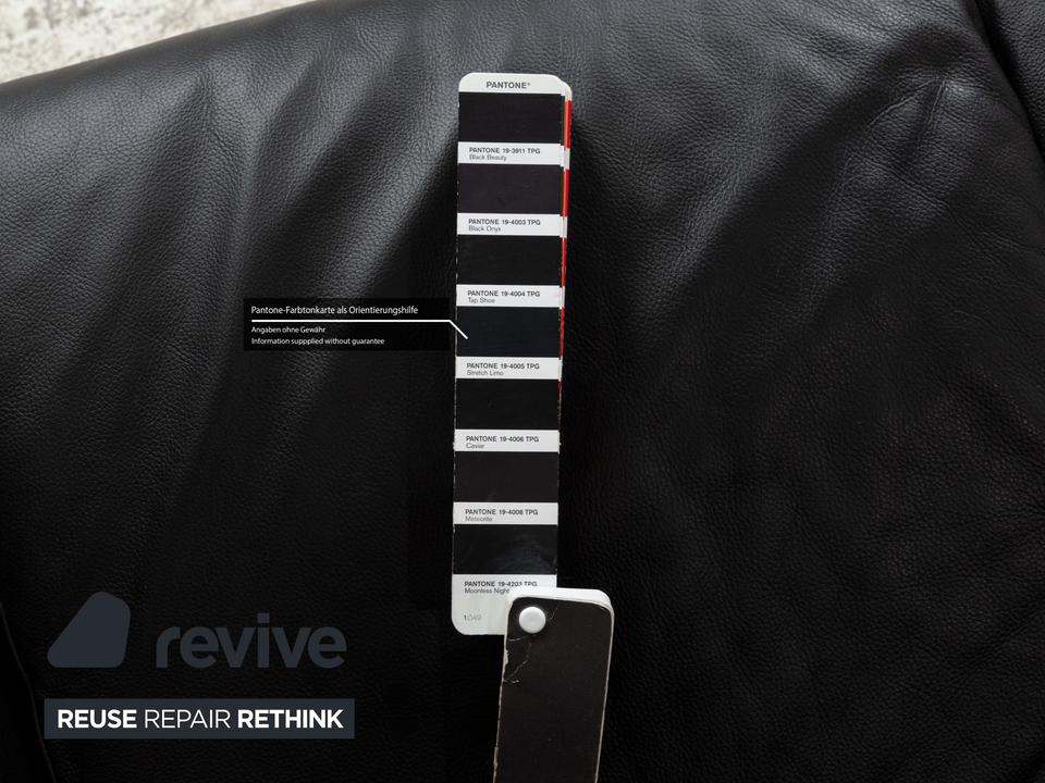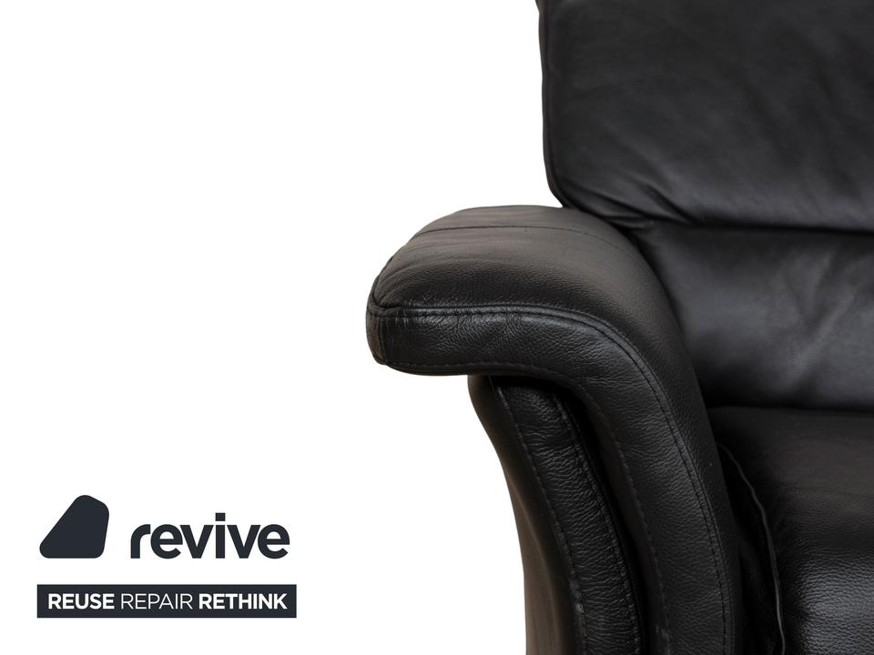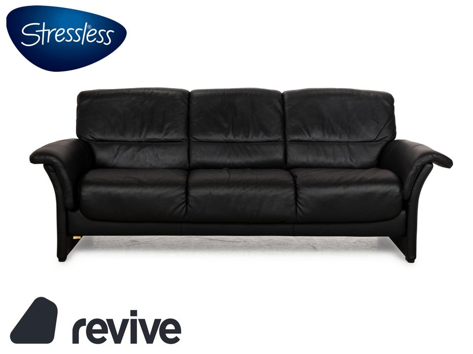 Das Sofa von Stressless ist mit einem schwarzen Leder bezogen und steht auf bodentiefen Seitenteilen. Der Dreisitzer zeichnet sich durch sein klassisches Design mit minimalen Schwüngen und hoher Rückenlehne aus.