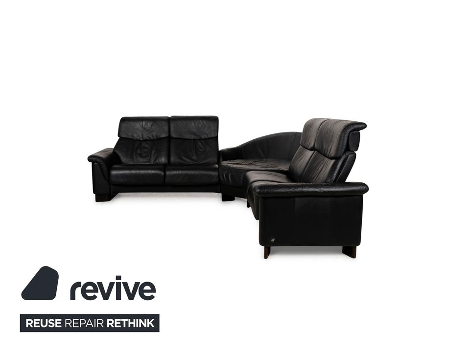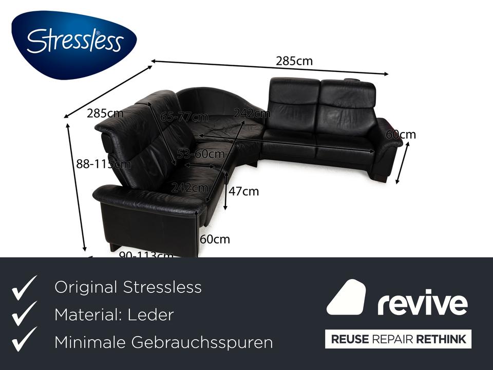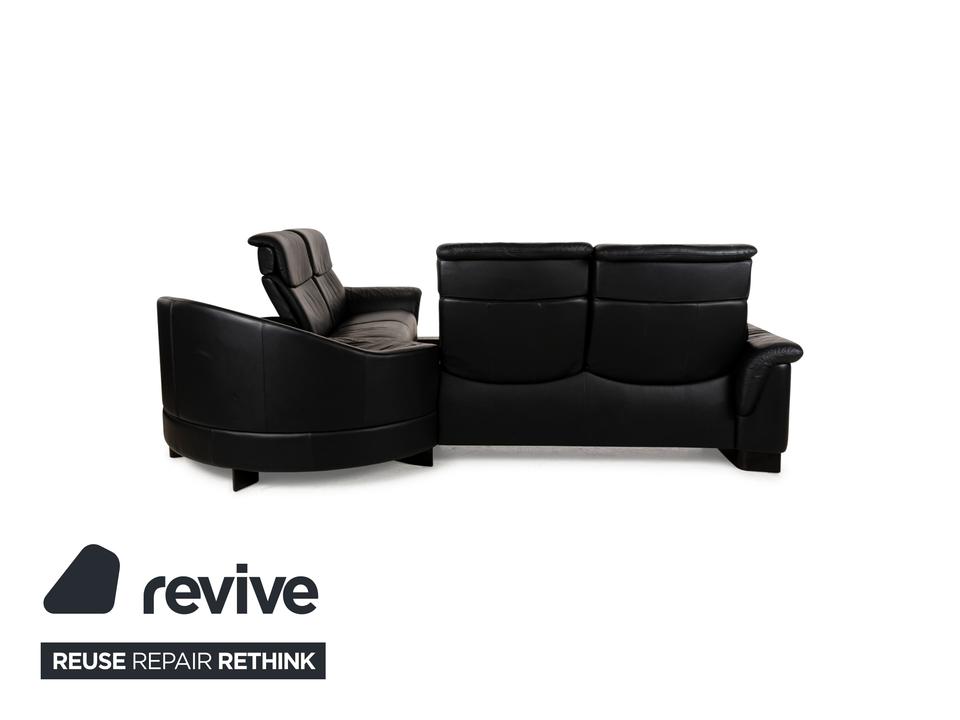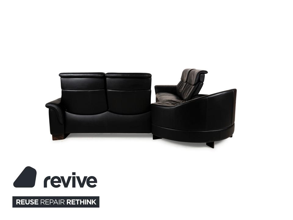 Das Sofa Paradise von Stressless ist mit schwarzem Leder bezogen und steht auf schmalen, schwarzen Holzfüßen. Es verfügt über zahlreiche, individuelle Verstellmöglichkeiten und garantiert so hohen Komfort. Das Ecksofa zeichnet sich durch das klassische, für den Hersteller typische Design aus,