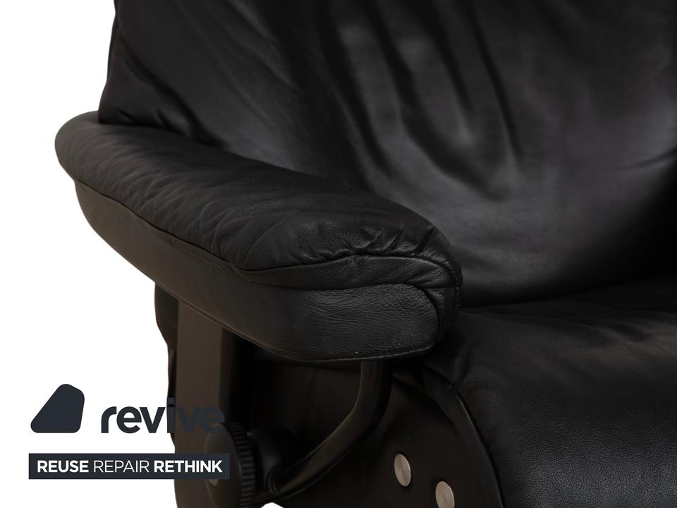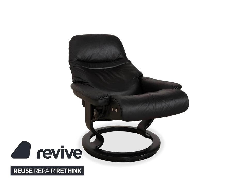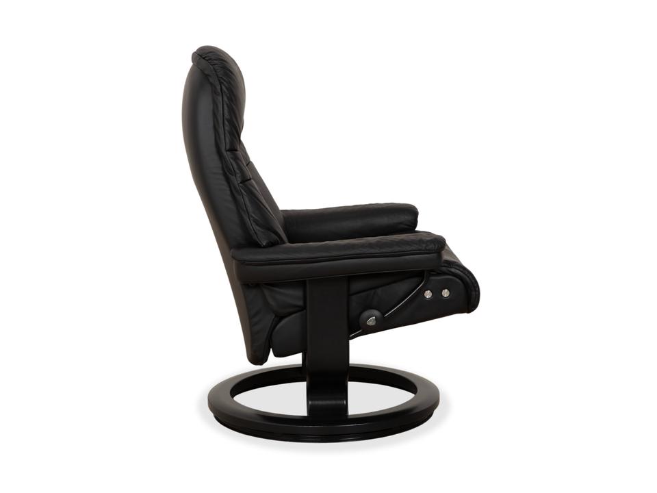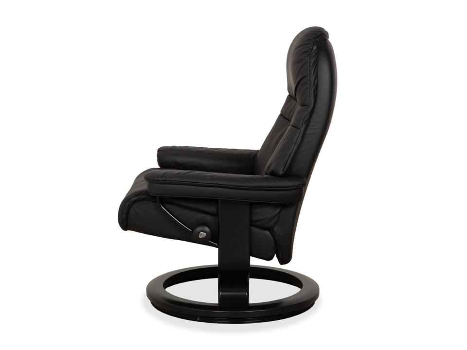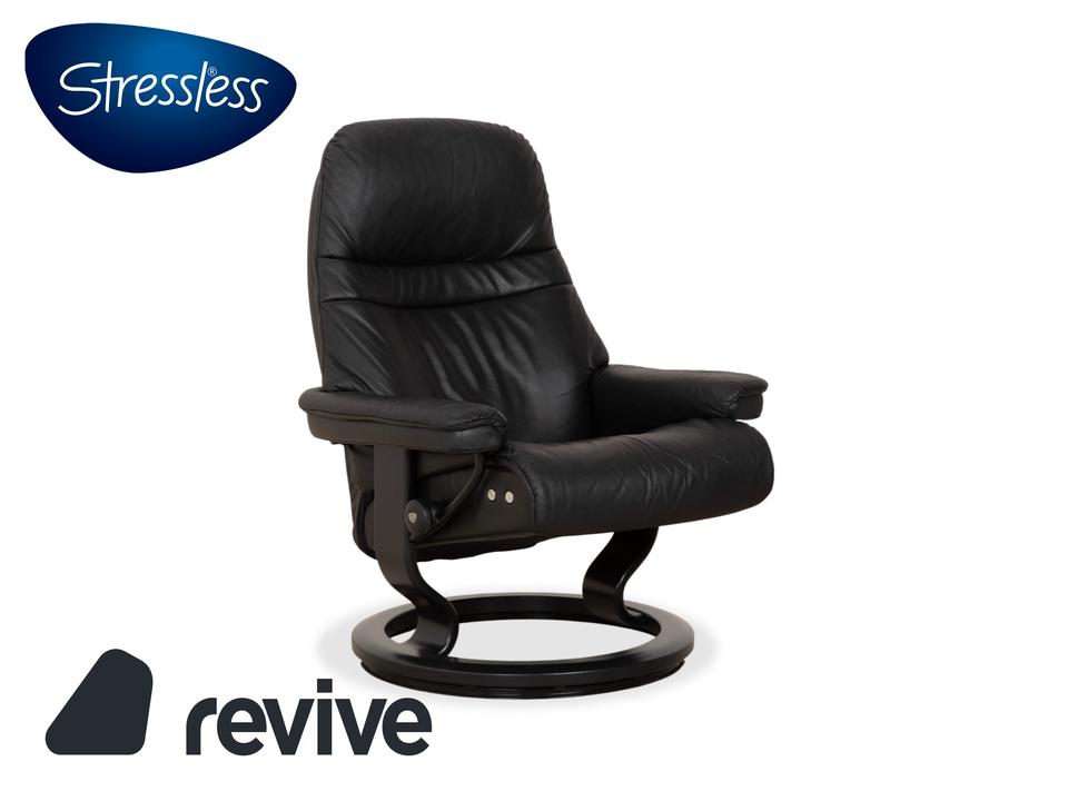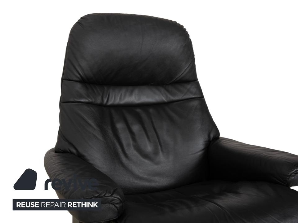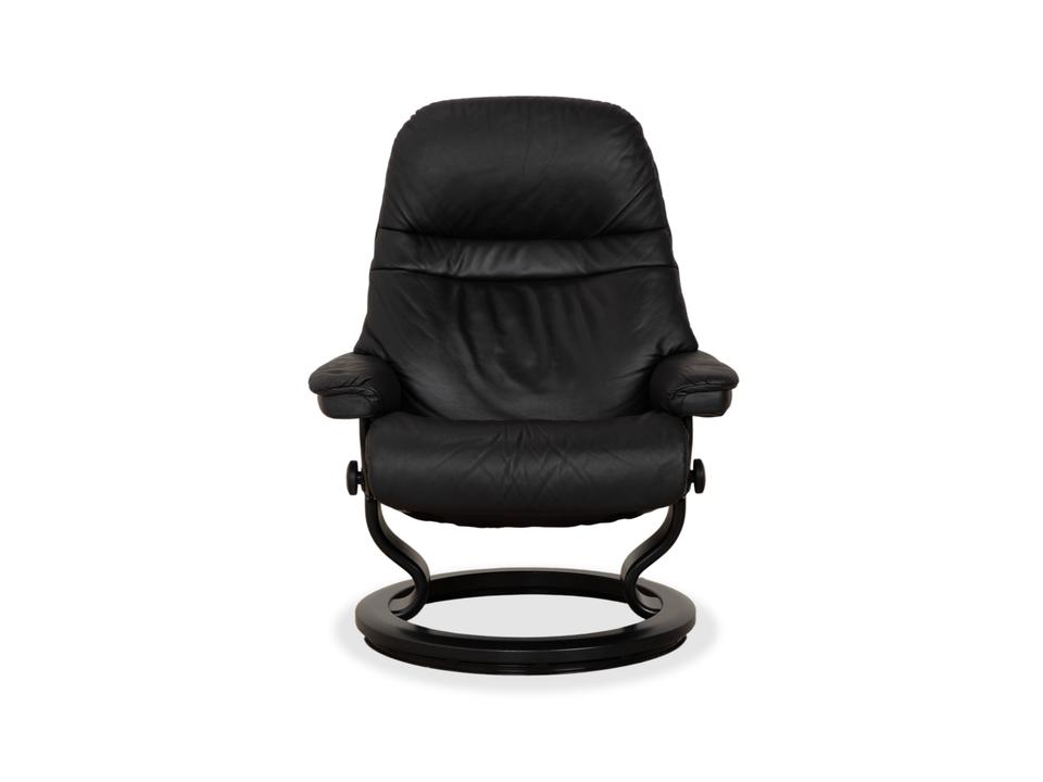 Mit dem Modell „Sunrise“ von Stressless holst du dir den Inbegriff skandinavischer Gemütlichkeit und Ergonomie ins Haus. Dieser Sessel gehört zu den beliebtesten Klassikern der norwegischen Marke und ist darauf ausgelegt, dir perfekte Erholung zu bieten.Der Bezug besteht aus einem hochwertigen, geschmeidigen Leder in einem tiefen Dunkelgrau bis Anthrazit, was dem Möbelstück eine sehr edle und zeitlose Ausstrahlung verleiht. Die Polsterung ist üppig und weich, wobei die charakteristischen Steppnähte im Rücken für eine optische Gliederung sorgen.Getragen wird der Sessel vom klassischen Stressless-Ringgestell aus dunklem Holz, das hier farblich perfekt auf das Leder abgestimmt ist und für Stabilität sorgt. Über das seitliche Drehrad lässt sich der Widerstand der manuellen Relaxfunktion (das patentierte Gleitsystem) individuell einstellen. So folgt der Sessel sanft jeder deiner Bewegungen und gleitet mühelos in eine entspannte Liegeposition.