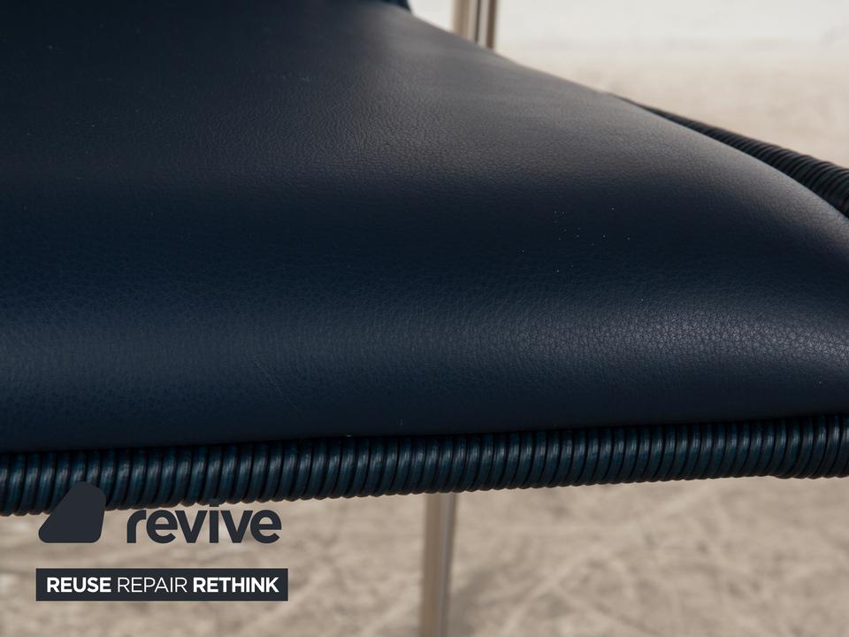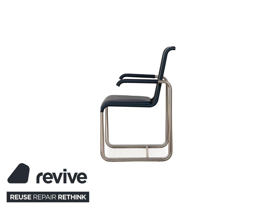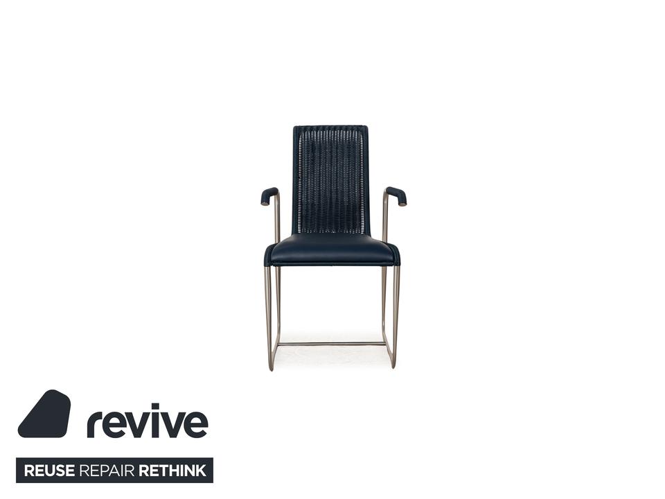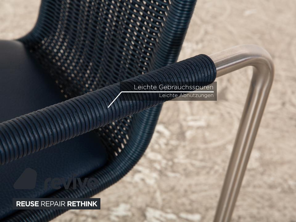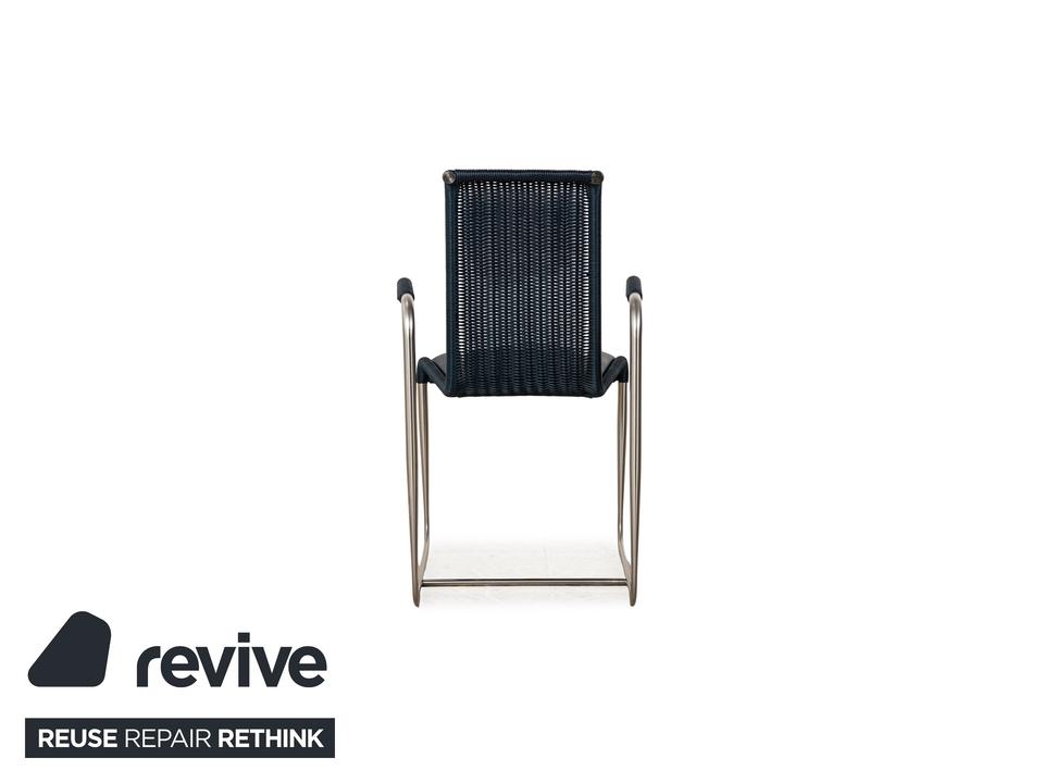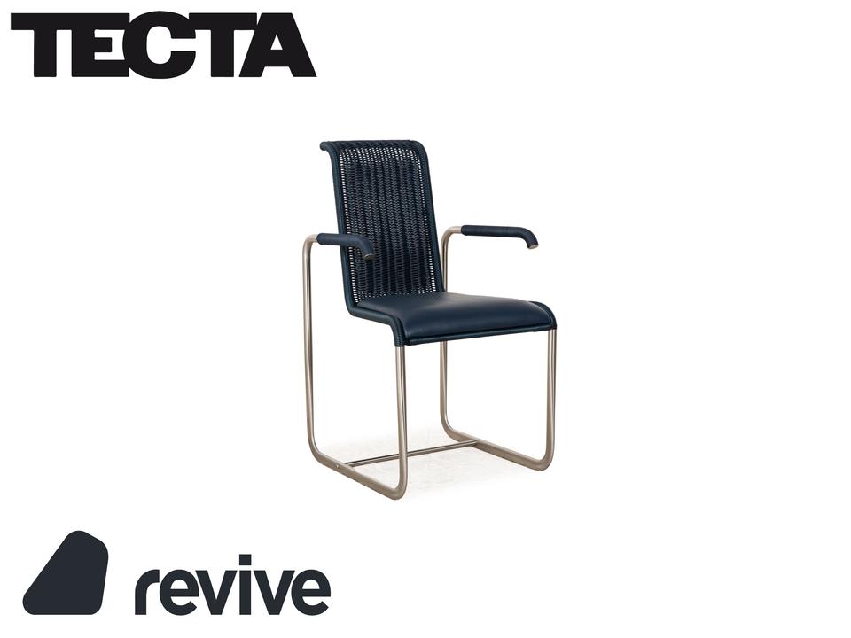 Der Thonet D20 Stuhl von Tecta besteht aus blauem Geflecht und steht auf einem schmalen Metallgestell. Die praktischen Armlehnen und das stilvolle Design zeichnen den Konferenzstuhl aus.