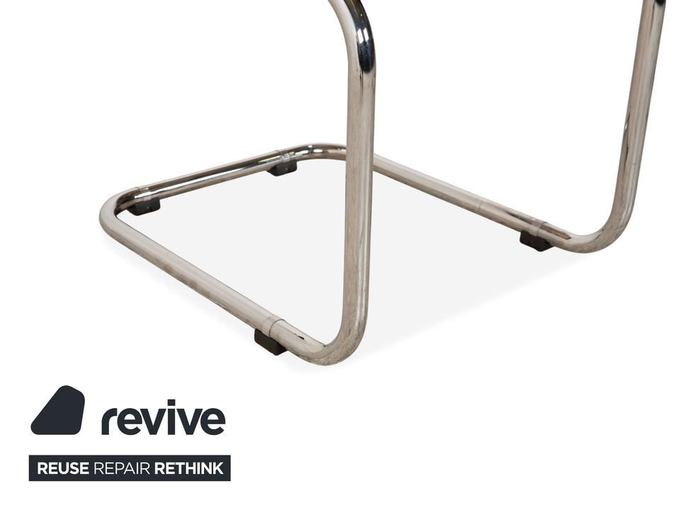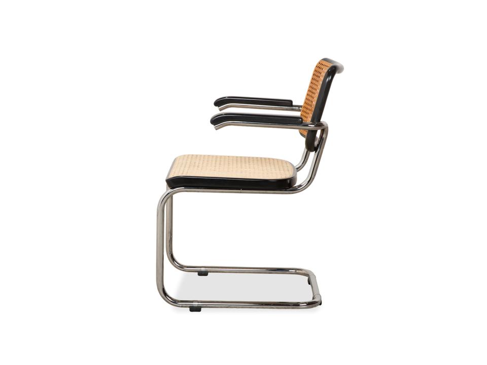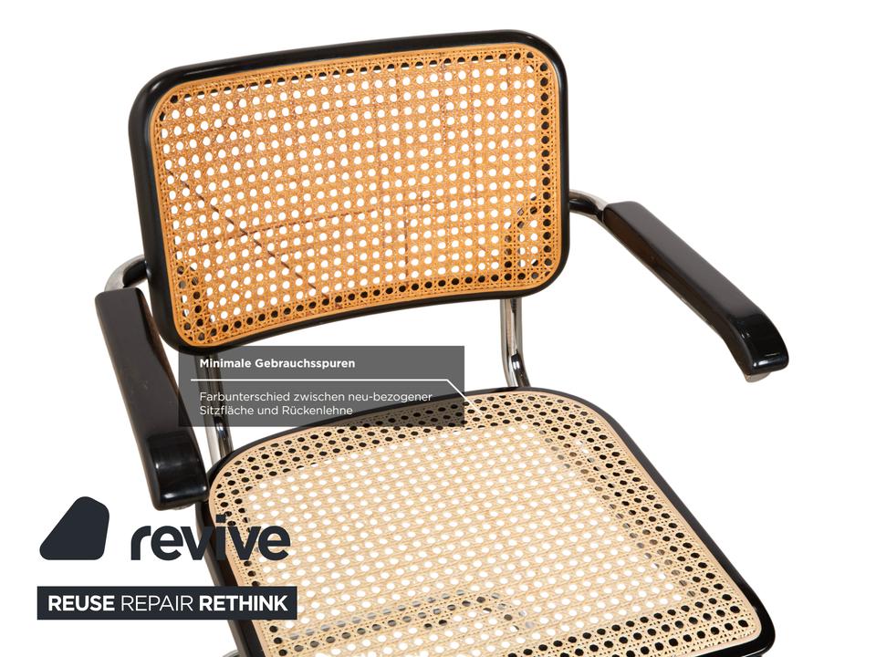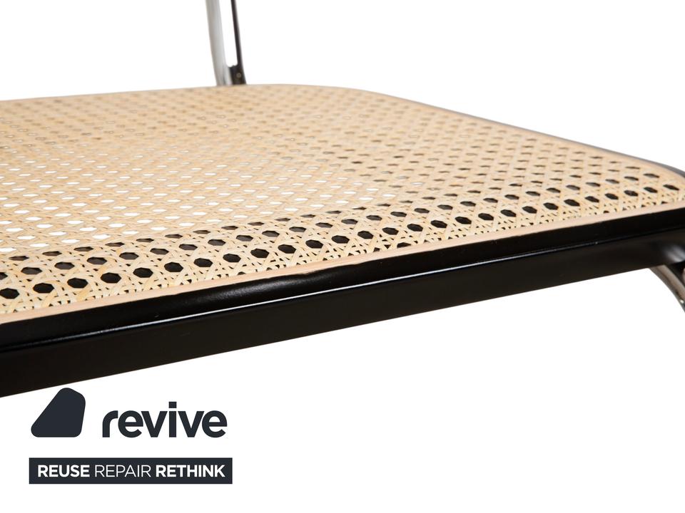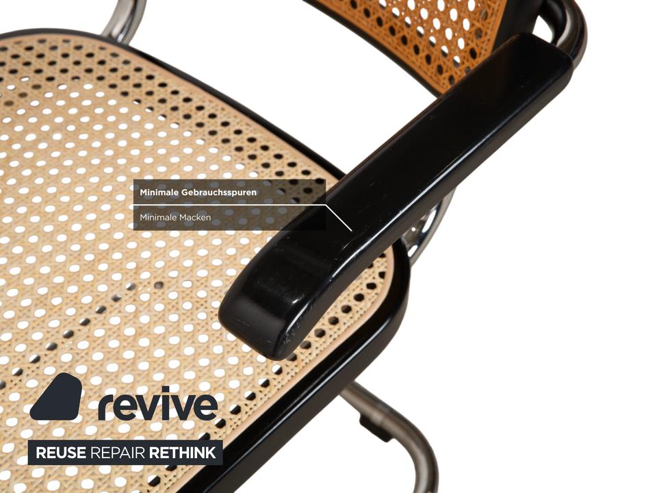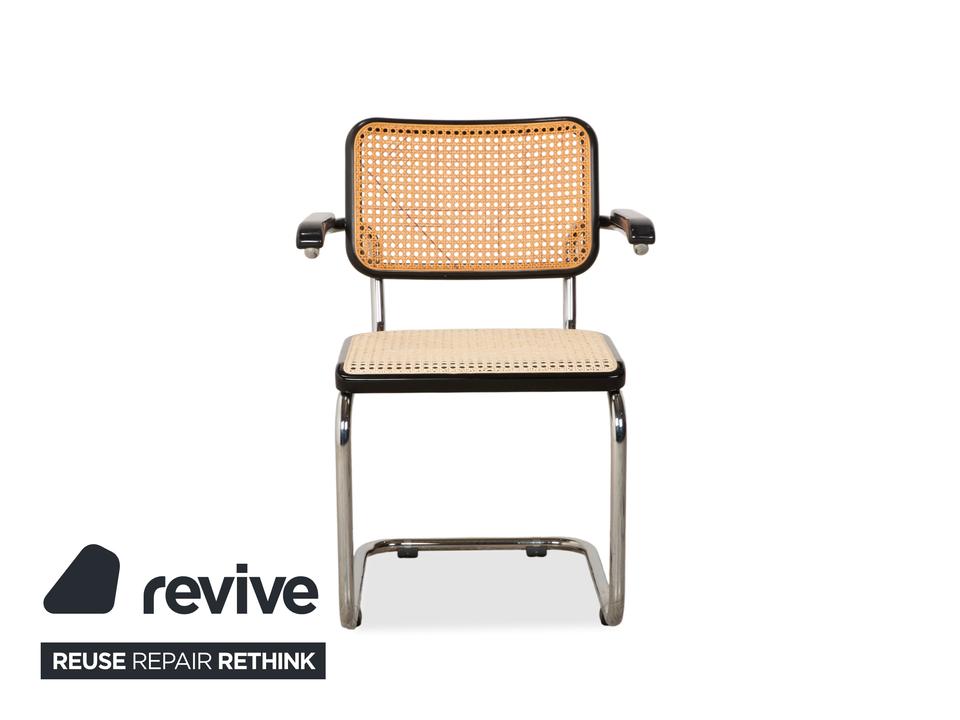 Thonet S 64: Die Ikone des Bauhaus-DesignsDieser Stuhl ist weit mehr als eine Sitzgelegenheit – er ist das vielleicht berühmteste Möbelstück der Designgeschichte. Mit dem S 64 (dem Modell mit Armlehnen) holst du dir den zeitlosen Geist von Marcel Breuer in deine vier Wände.Die Ästhetik lebt von einem faszinierenden Kontrast: Das schwarz gebeizte Buchenholz bildet einen markanten Rahmen für das helle, luftige Wiener Geflecht in Sitz und Rücken. Dieses natürliche Material nimmt der strengen Form die Schwere und sorgt für Transparenz.Getragen wird die Konstruktion vom legendären verchromten Stahlrohr-Gestell, das in einer einzigen geschwungenen Linie verläuft. Als Freischwinger bietet der Stuhl einen einzigartigen Komfort, da er bei Bewegungen sanft nachgibt. Die schwarzen Holzarmlehnen runden das ergonomische Erlebnis ab und unterstreichen die grafische Klarheit des Entwurfs.