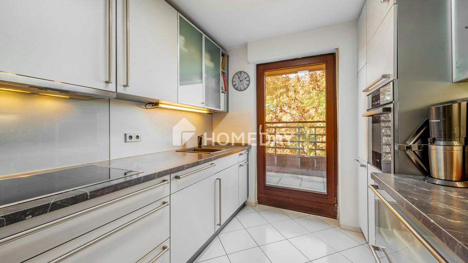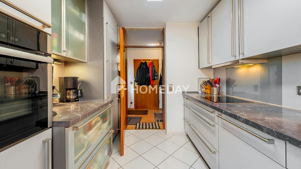 Im Wohnbereich schafft ein Kamin eine warme, gemütliche Stimmung, während die elektrischen Rollläden zusätzlichen Komfort bieten. Die hochwertige Einbauküche mit Markengeräten ist im Kaufpreis enthalten und bietet sowohl funktionale als auch ästhetische Qualität. Das Badezimmer ist mit einer Badewanne ausgestattet und rundet den Wohnkomfort ideal ab.