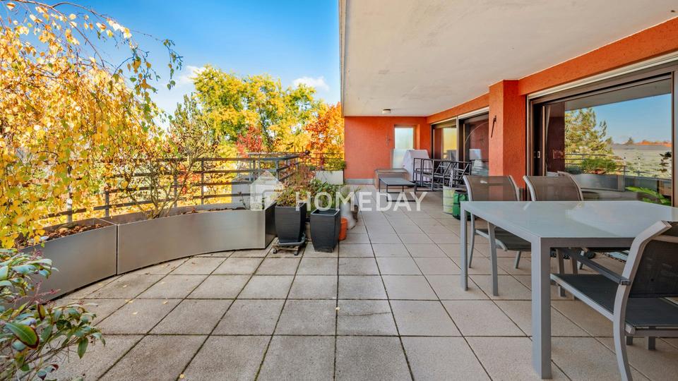 Ein besonderes Highlight ist die beeindruckende West-Dachterrasse mit rund 53 Quadratmeter Fläche, die teilweise überdacht und mit Windschutz versehen ist. Hier lässt sich die Sonne bis in die Abendstunden genießen – ideal zum Entspannen, Grillen oder geselligen Beisammensein mit Freunden. Große Fensterfronten und die westliche Ausrichtung sorgen zudem für eine freundliche, sehr helle Wohnatmosphäre.
