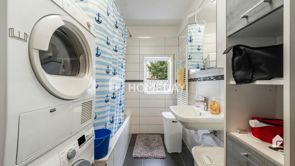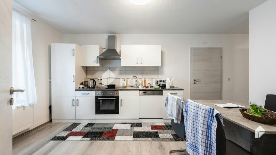 • Die Wohnräume sind mit gepflegtem Laminat und Fliesen gestaltet.