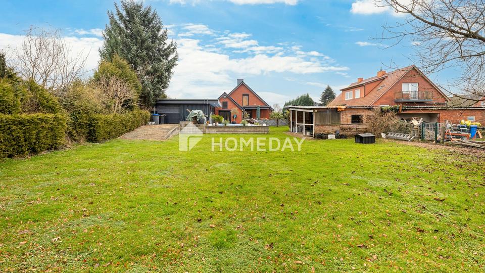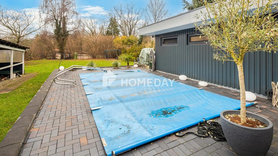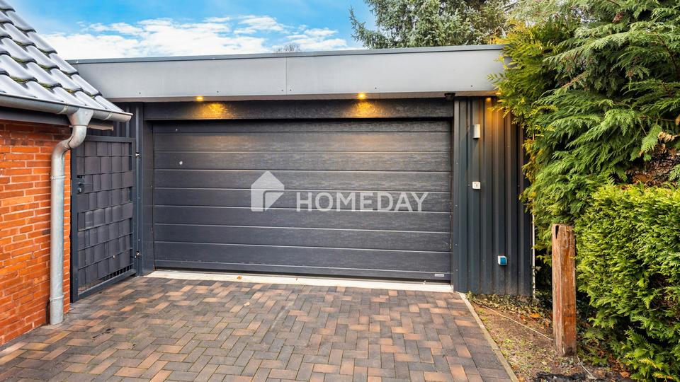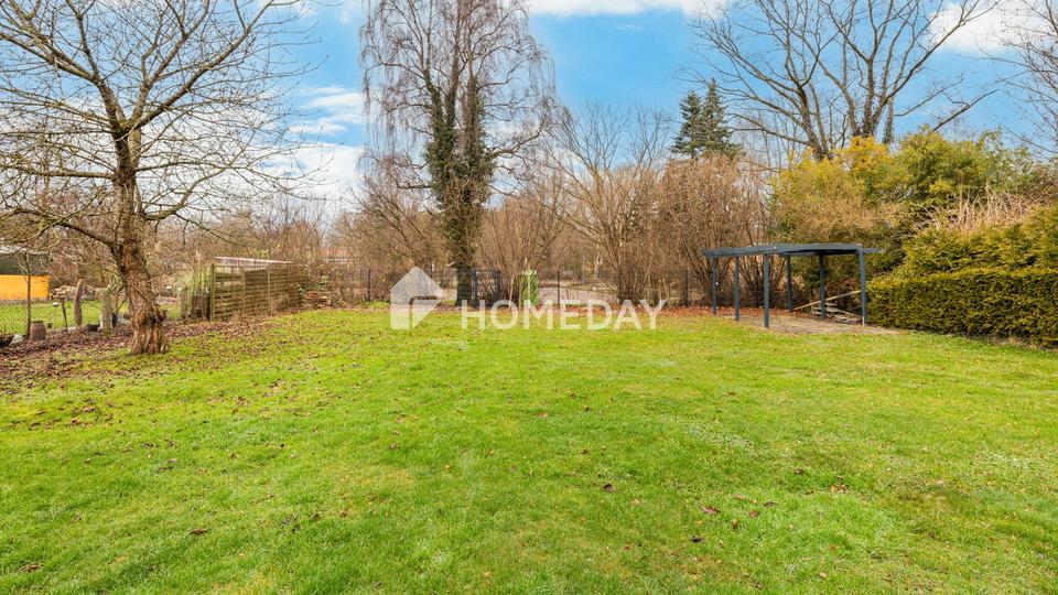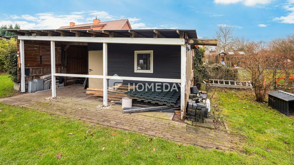 Die Gartenanlage selbst ist wunderschön angelegt und bietet genügend Grün für entspannte Stunden, während ein großzügiges Gartenhaus für praktischen Stauraum sorgt, damit Ihre Oase stets aufgeräumt bleibt.