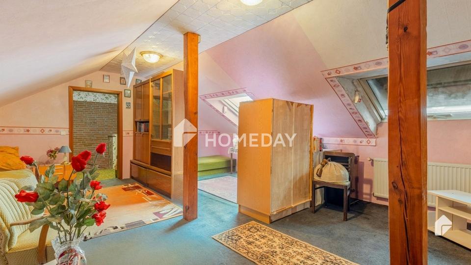 Das Dachgeschoss beherbergt ein großes, vielseitig nutzbares Zimmer mit eigenem Duschbad sowie ein weiteres, bereits isoliertes Zimmer, das mit etwas Kreativität zusätzlich ausgebaut werden kann.