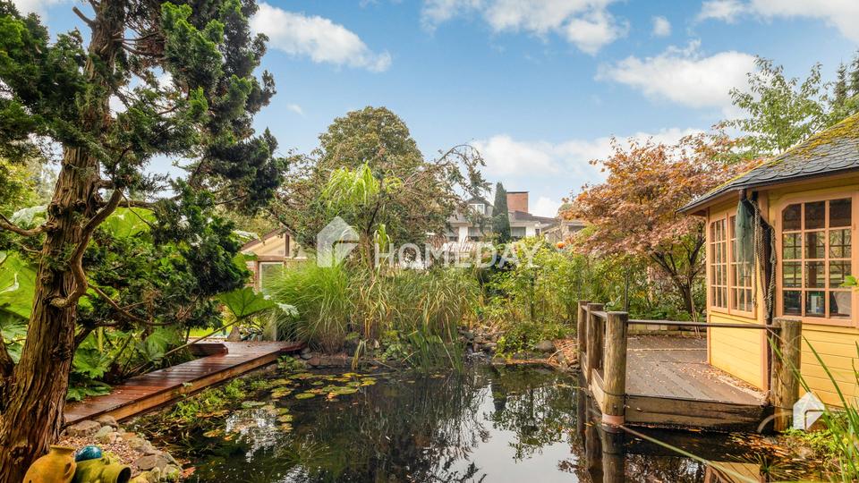 Für Ihre Fahrzeuge stehen mehrere Garagen sowie zusätzliche Stellplätze zur Verfügung. Der weitläufige Garten bildet ein echtes Highlight: Ein charmantes Häuschen am Teich, ein idyllischer Sitzplatz im Grünen und ein kleiner Flusszugang mit Brücke schaffen eine besondere Atmosphäre – ideal für Naturliebhaber und Erholungssuchende.