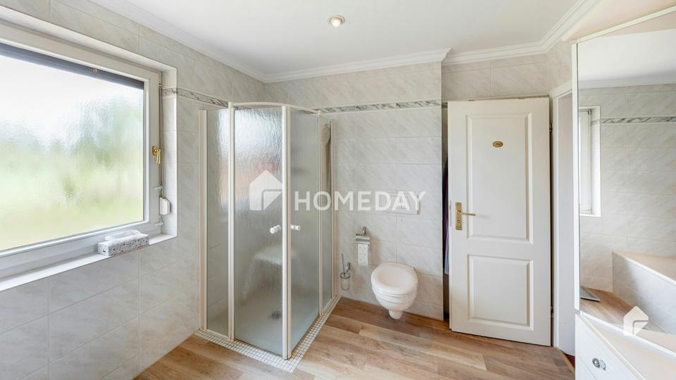 • Ein weiteres Tageslichtbadezimmer befindet sich im Kellergeschoss und ist mit einer Eckbadewanne und einem Bidet ausgestattet.