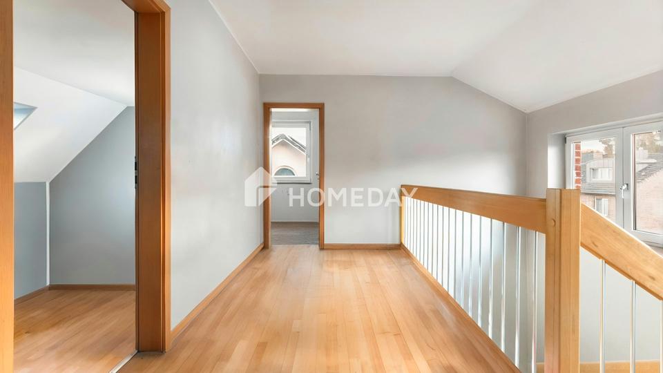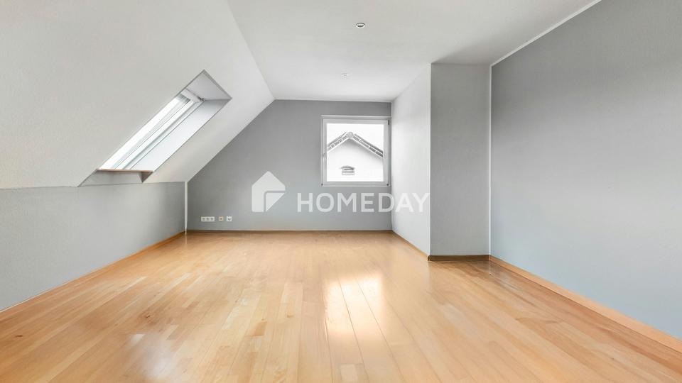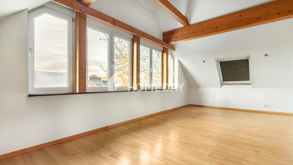 Ein besonderes Highlight ist das Dachgeschoss mit seinen sichtbaren Holzbalken, die dem Raum einen charmanten und warmen Charakter verleihen.