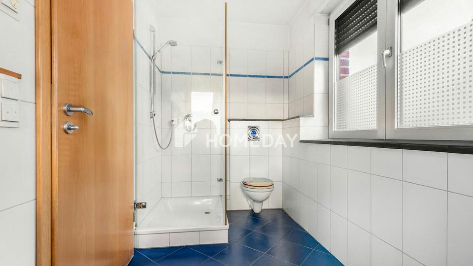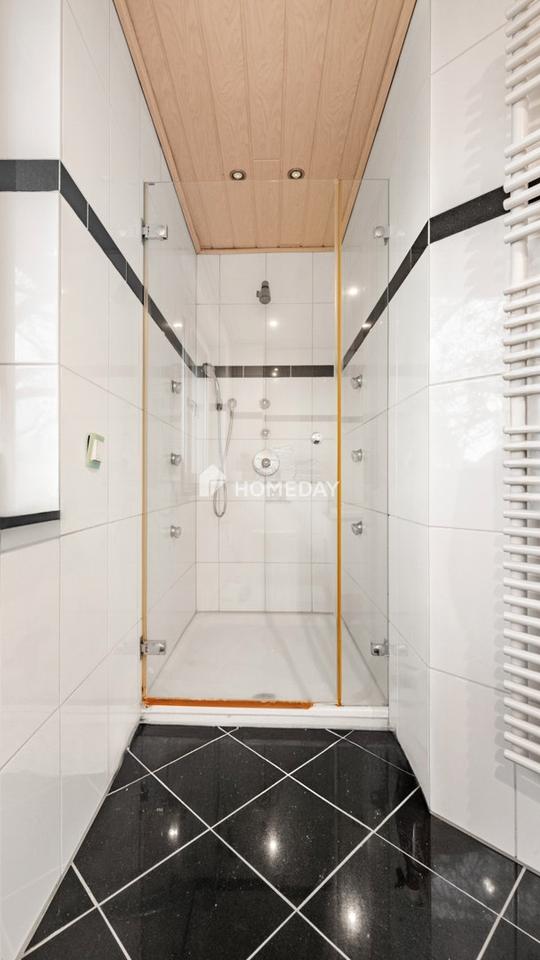 Das Badezimmer im ersten Obergeschoss ist besonders hochwertig ausgestattet – mit einer Massagedusche und