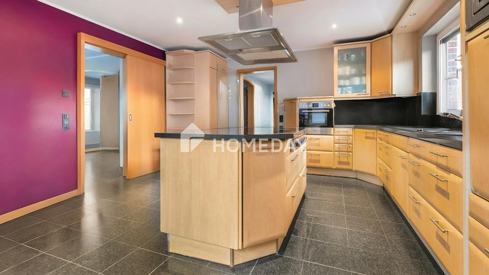 Die Einbauküche ist mit einer modernen Kücheninsel ausgestattet und bietet ausreichend Platz für gemeinsame Kochmomente. Insgesamt verfügt das Haus über sieben Zimmer, darunter auch ein praktisches Ankleidezimmer, mehrere Abstellräume sowie drei Bäder.