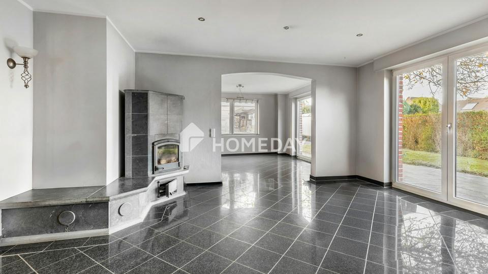 Im Inneren überzeugt das Haus durch helle, offen geschnittene Räume und eine freundliche Wohnatmosphäre. Die zahlreichen Fensterflächen sorgen in allen Etagen für viel Tageslicht und unterstreichen das großzügige Raumgefühl. Das Wohnzimmer im Erdgeschoss präsentiert sich weitläufig und einladend, mit direktem Zugang zur Terrasse und zum Garten. hier sorgt ein gemauerter Kachelofen für eine wohlige Wärme.