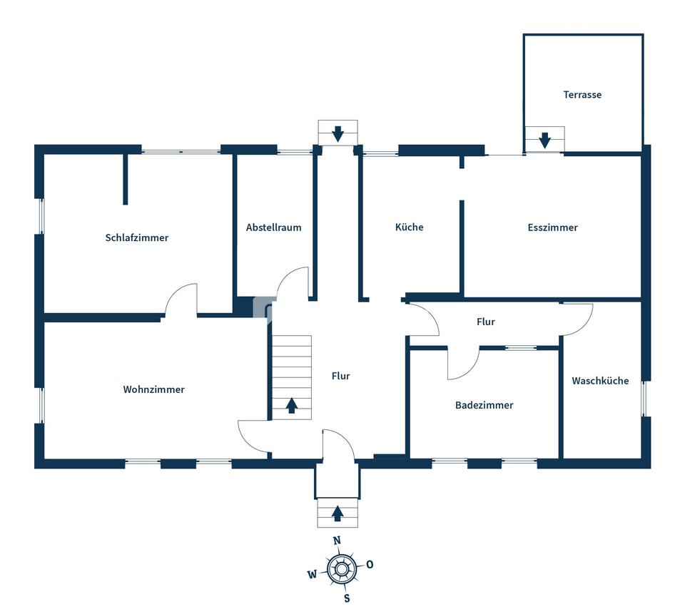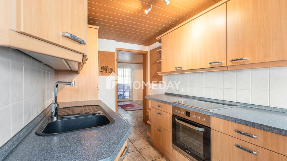 Im Erdgeschoss empfängt Sie ein zentraler Flur, von dem aus sich die Räume funktional erschließen. Das großzügige Wohnzimmer bildet das Herzstück dieser Ebene. Große Fenster sorgen für viel Tageslicht, während der Kaminofen eine warme, behagliche Wohnatmosphäre schafft. Hier lässt sich das Wohnen sowohl gemütlich als auch repräsentativ gestalten. Vom Wohnzimmer aus gelangen Sie direkt in ein angrenzendes Schlafzimmer. Vom Flur aus sind zudem weitere Räume erreichbar: Die vorhandene Einbauküche ist praktisch geschnitten und bietet eine solide Grundlage für zukünftige Modernisierungen. Das Esszimmer schafft einen direkten Zugang zur Terrasse sowie zum Garten und verbindet den Innen- und Außenbereich auf angenehme Weise. Ergänzt wird das Raumangebot durch eine separate Waschküche, einen Abstellraum sowie ein Tageslichtbad mit Eckbadewanne.
