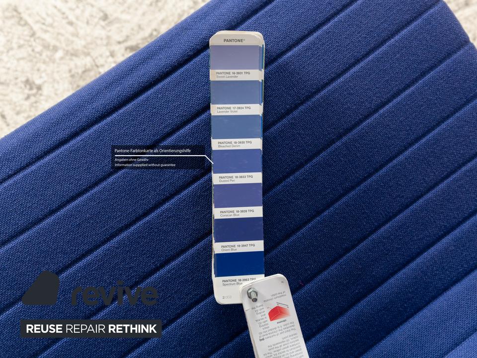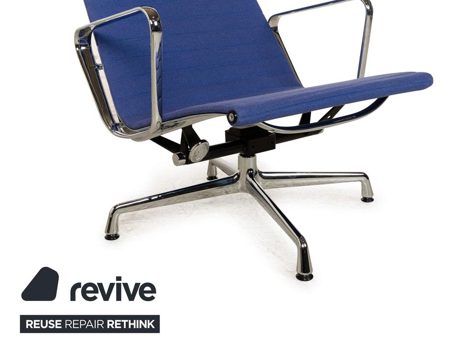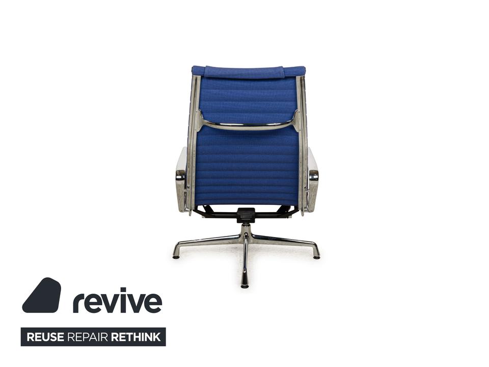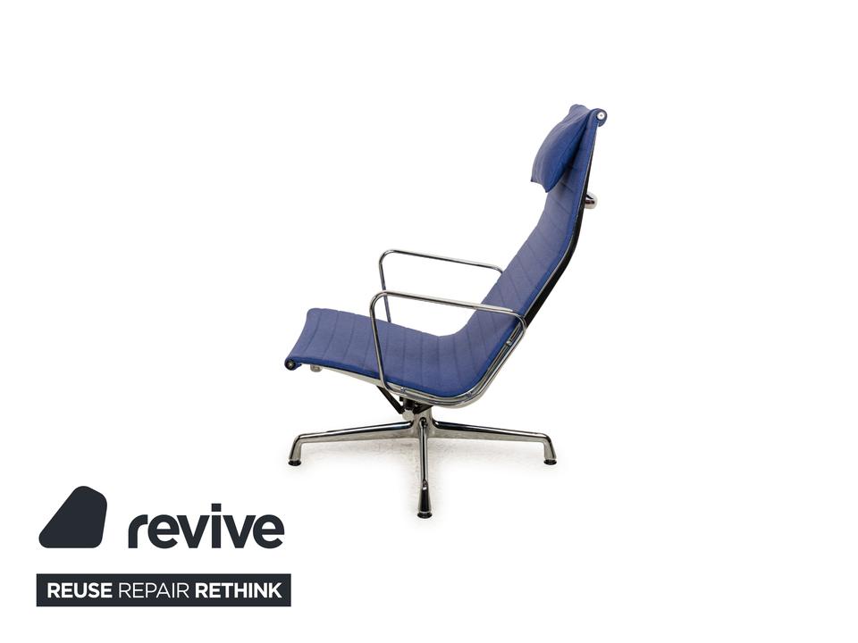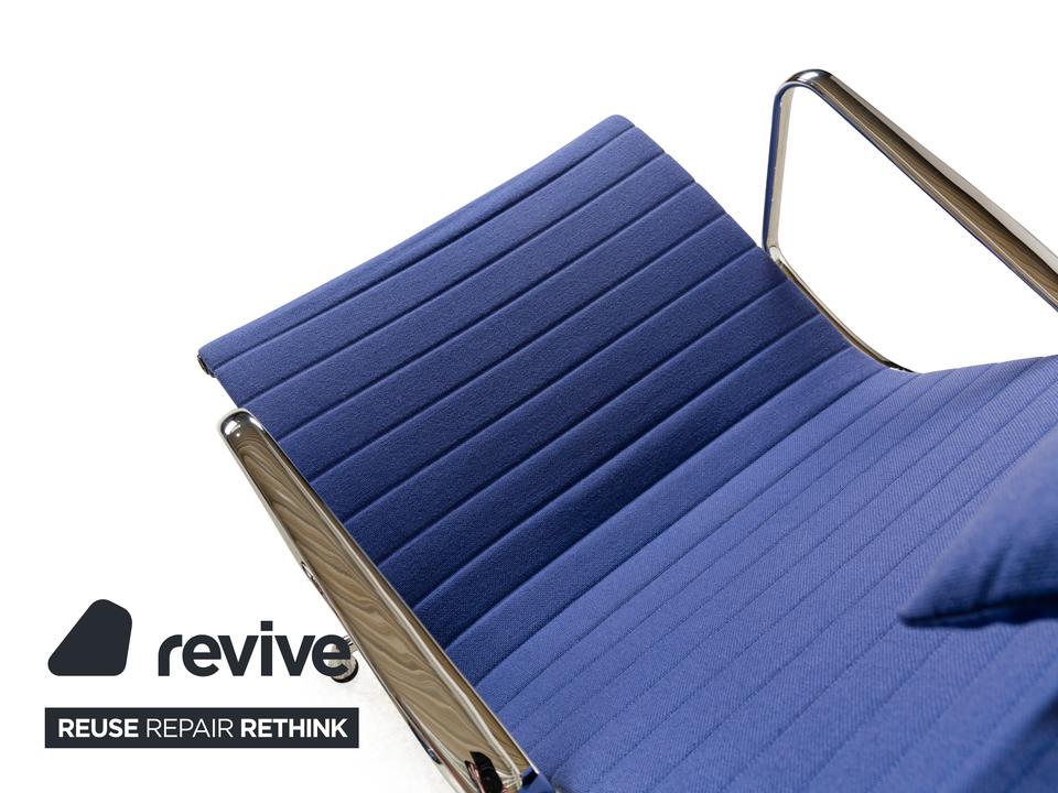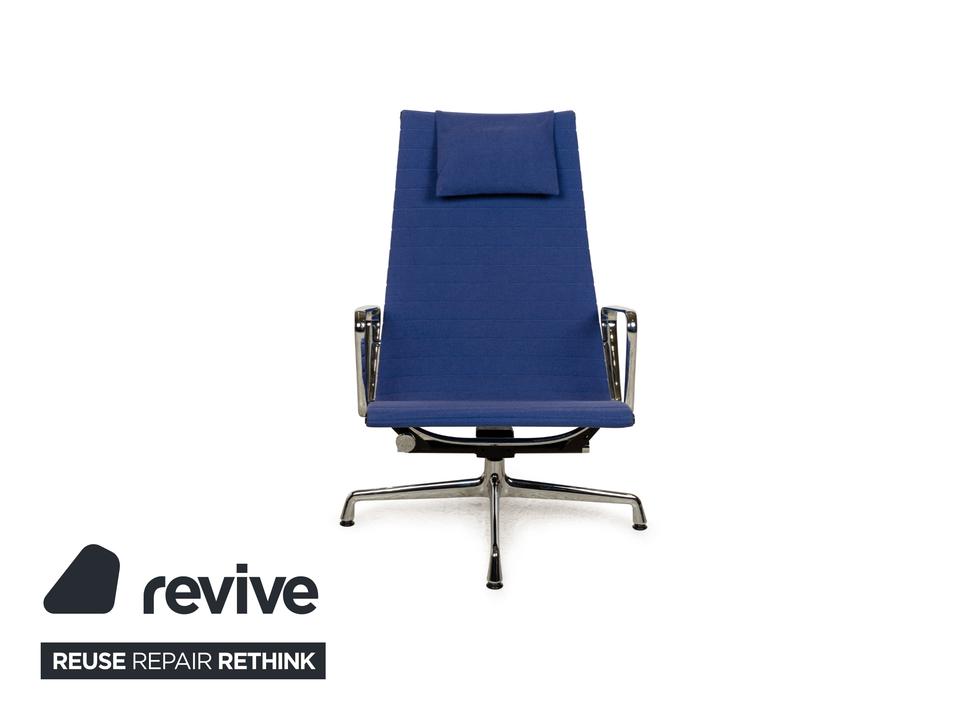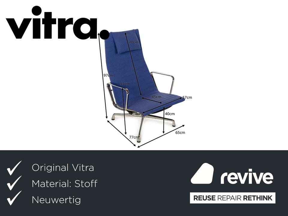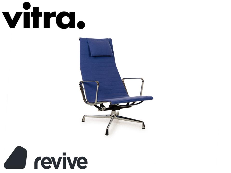 Der Vitra EA 124 Hochlehnsessel ist mit hochwertigem Stoff in Blau bezogen und sieht nicht nur bequem aus, sondern bringt auch einen ergonomischen Faktor mit sich, denn er verfügt über eine Wippfunktion. Komfort und gutes Design gehen bei Vitra generell, bei diesem Sessel aber insbesondere Hand in Hand. Elegante Metallelemente gehen einen spannenden Kontrast zum Stoffbezug ein.
