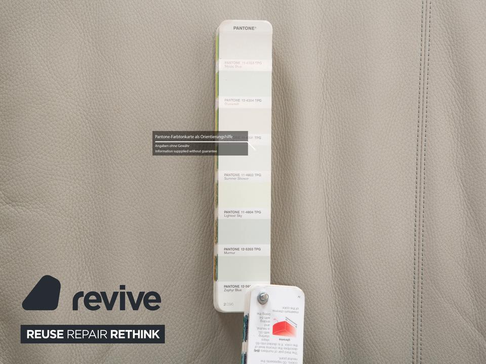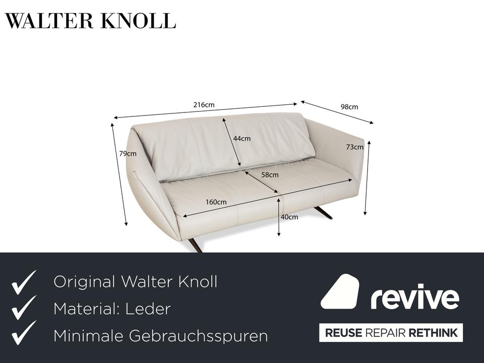 Das Sofa Bundle von Walter Knoll überzeugt durch seine außergewöhnliche Grundform. Der mit hellgrauem Echtleder bezogene Körper des Dreisitzers steht auf metallenen Kufen.