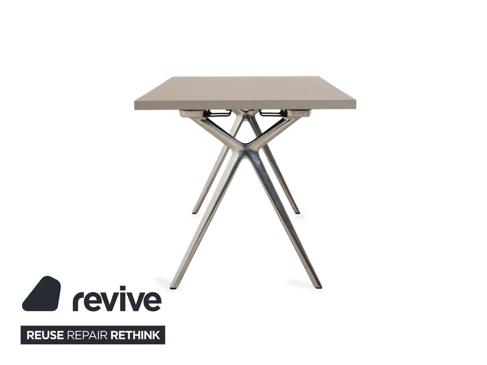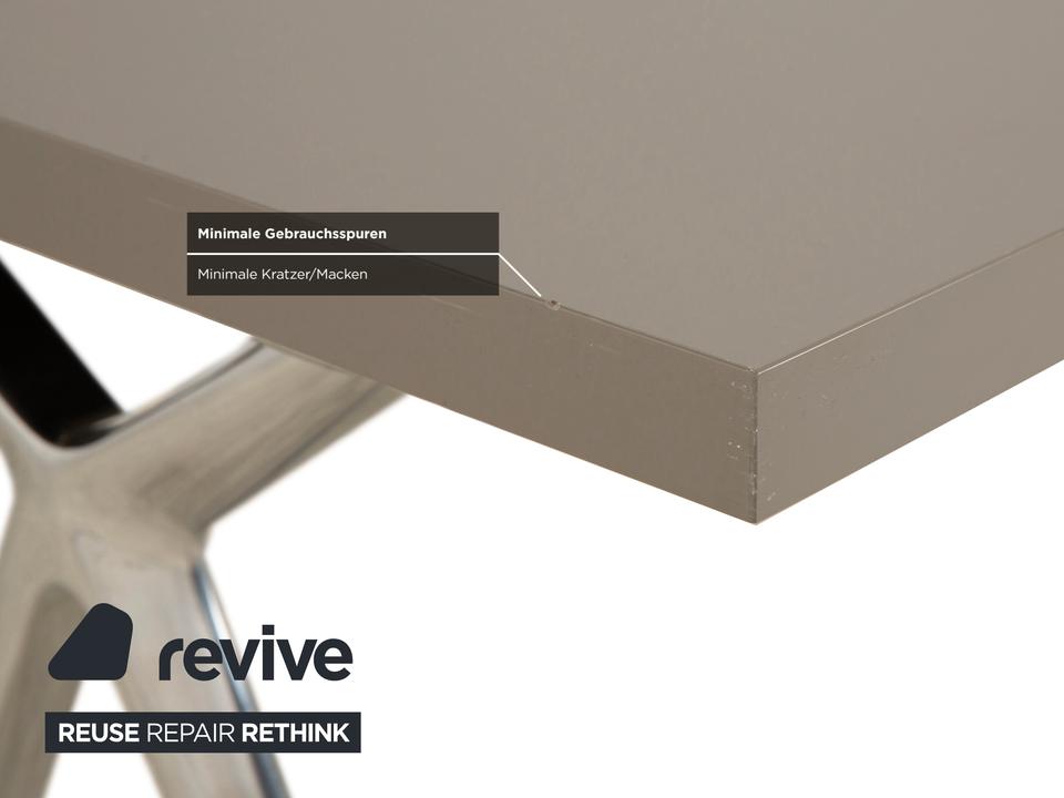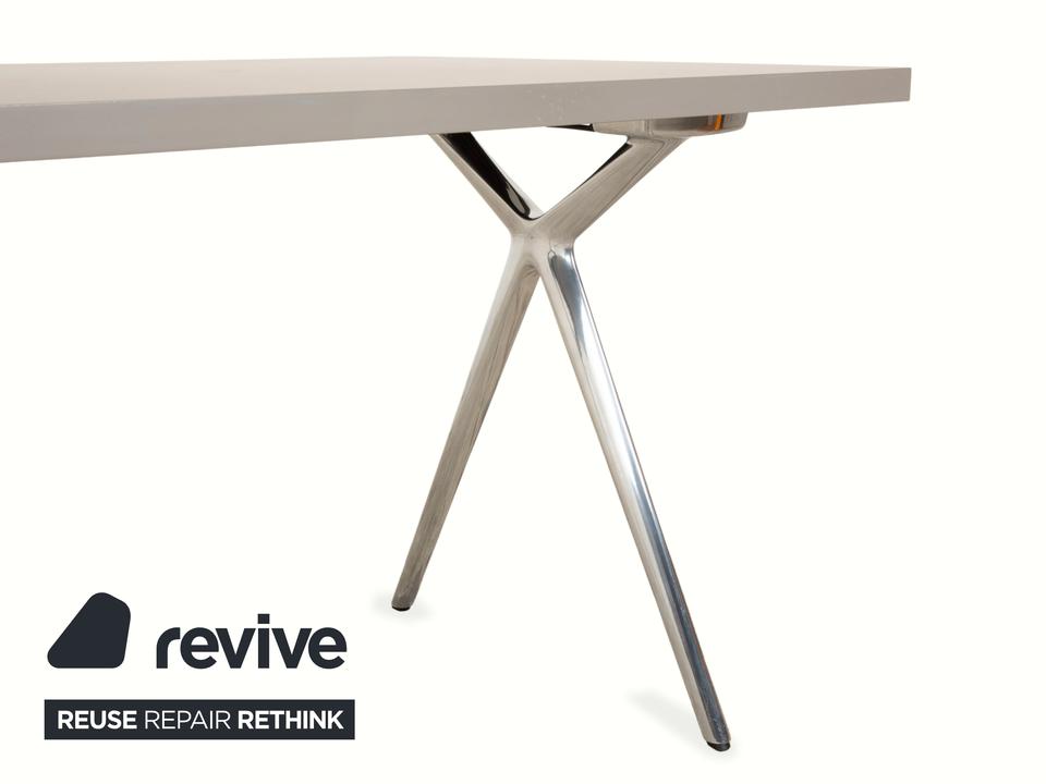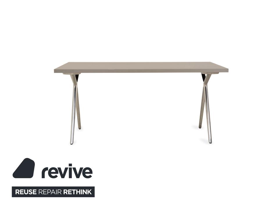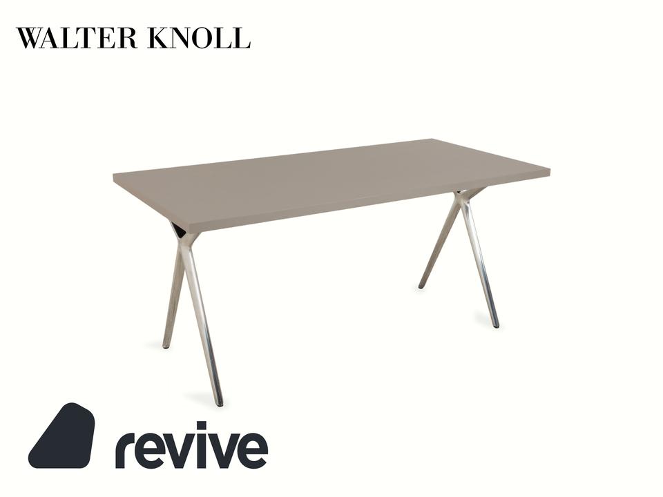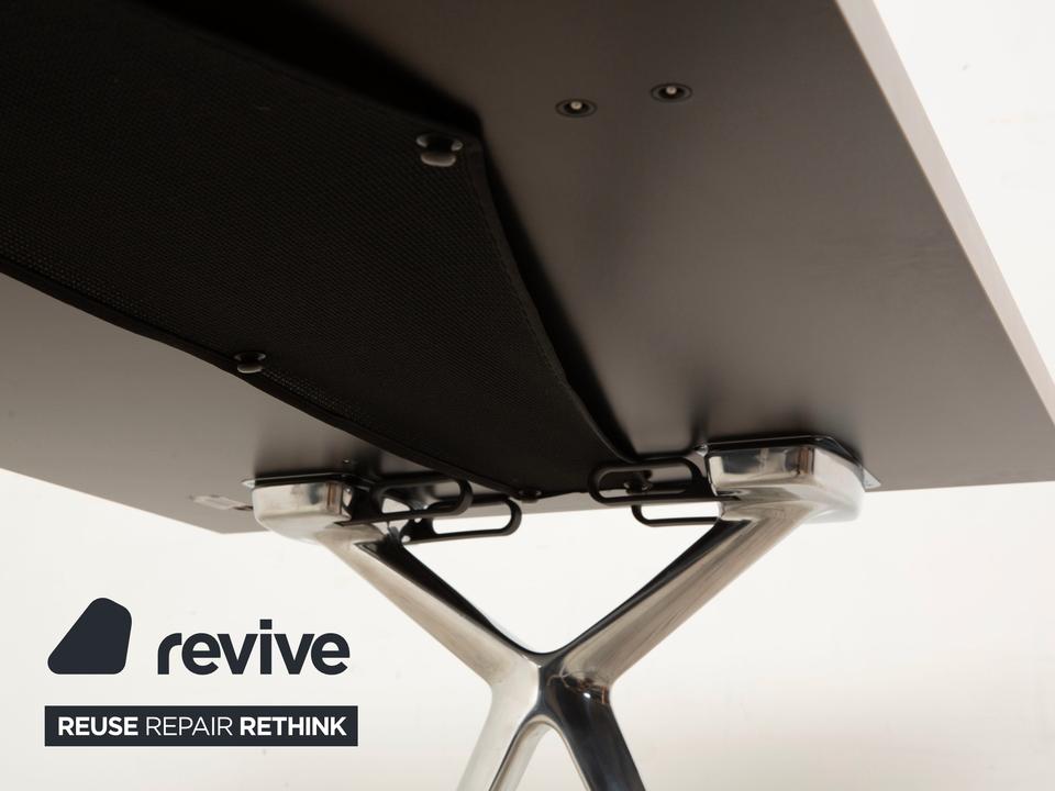 Der Conference-X Tisch von Walter Knoll ist ein Konferenz- oder Schreibtisch mit klarer, funktionaler Gestaltung. Die hellgraue Tischplatte ruht auf einem X-förmigen Gestell aus Metall in Chromoptik. Unter der Platte befindet sich eine Kabelwanne aus schwarzem Netzgewebe, die zur ordentlichen Kabelführung dient.