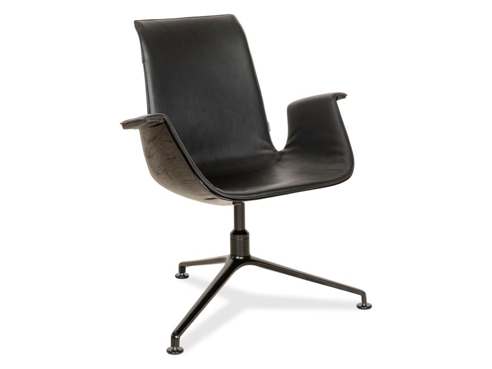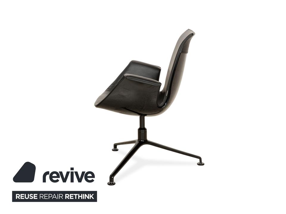 Der Sessel FK von Walter Knoll ist mit einem schwarzen Echtleder bezogen und steht auf einem Dreifuß. Der Schalensessel zeichnet sich durch seine stilvolle, schlichte Optik aus und bietet zusätzlich Komfort durch seine Drehfunktion.