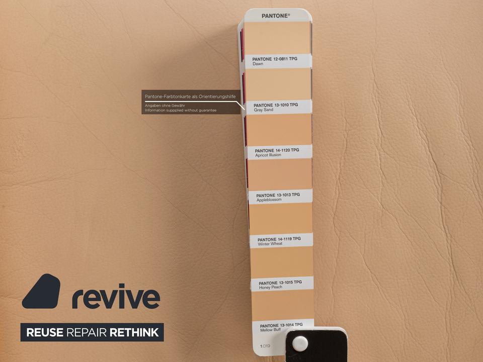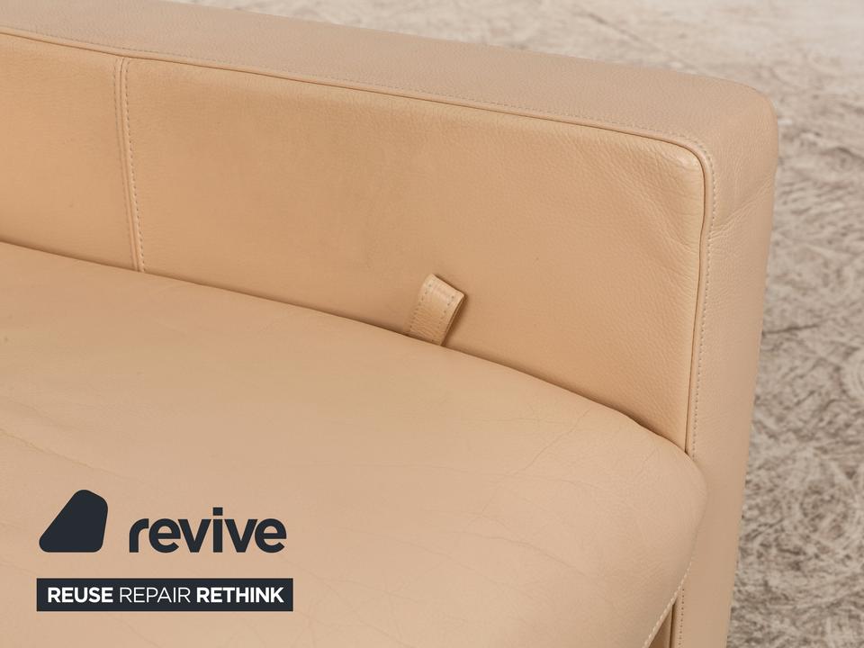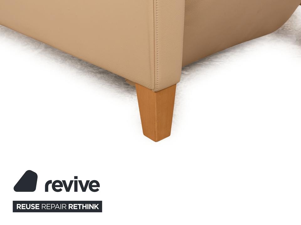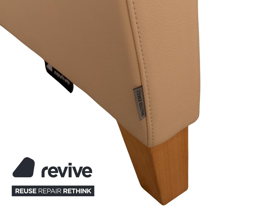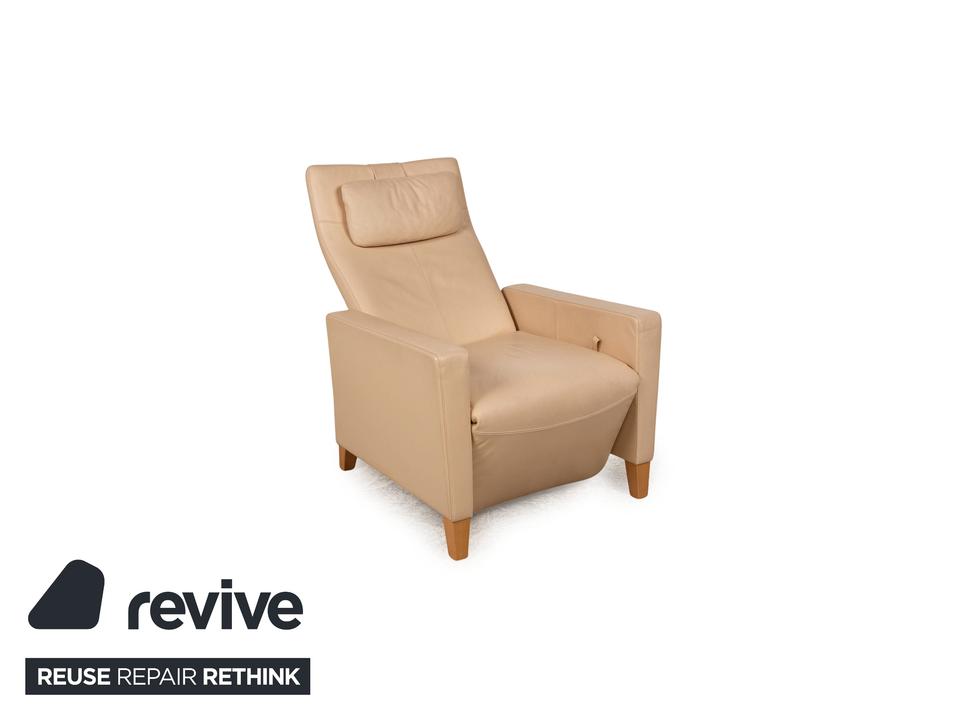 Der Sessel von Walter Knoll ist mit einem beigen Echtleder bezogen und steht auf schmalen Holzfüßen. Die praktische Relaxfunktion zeichnet ihn aus.