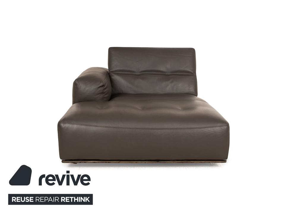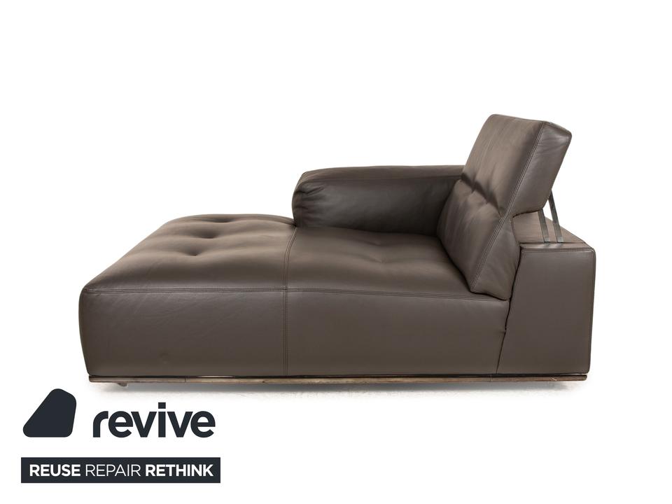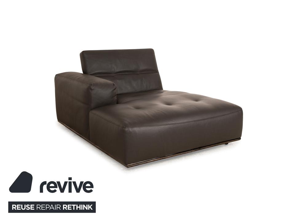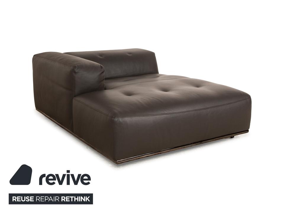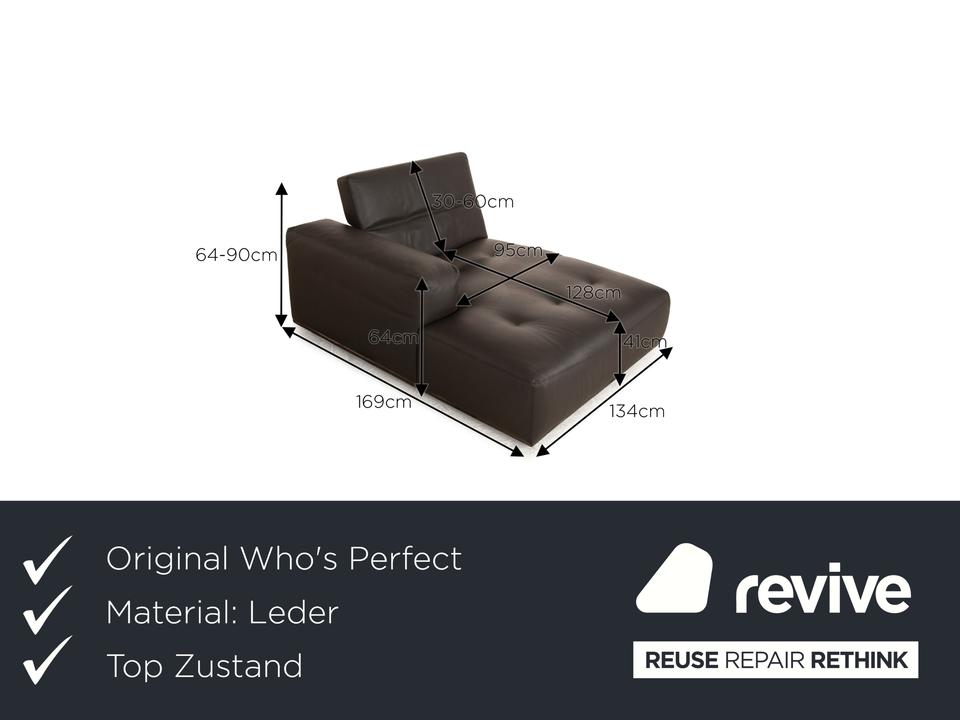 Die Liege von Who’s Perfect ist mit einem braunen Echtleder bezogen und steht auf unauffälligen Füßen. Sie zeichnet sich durch das gradlinige, kompakte Design und die minimalistische Optik aus. Die Kopfstütze ist klappbar.