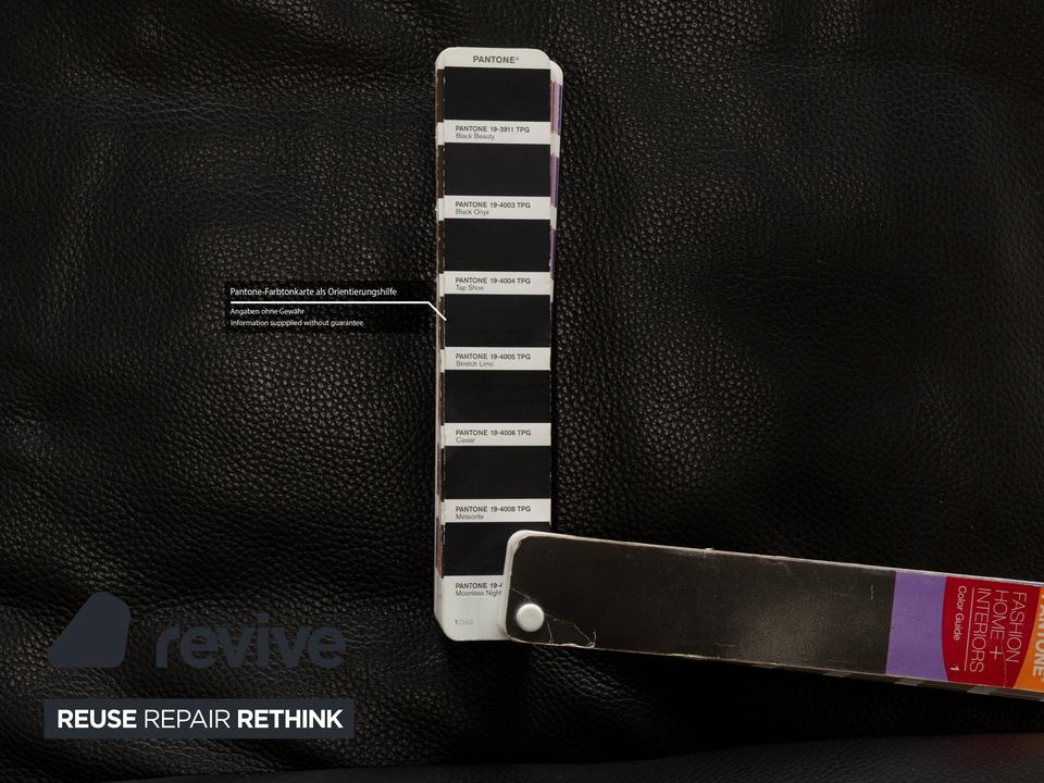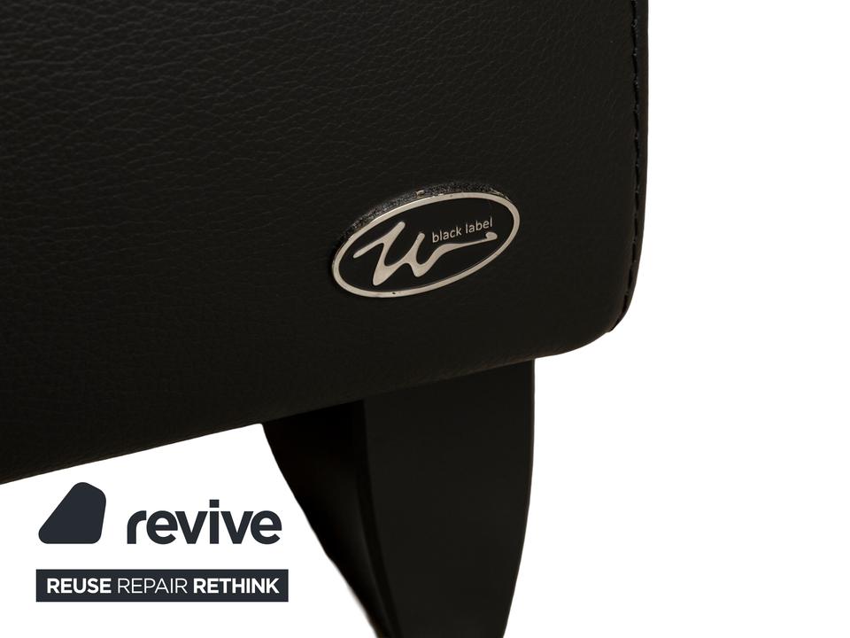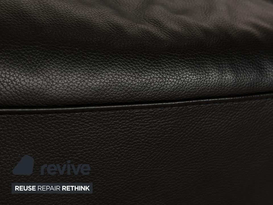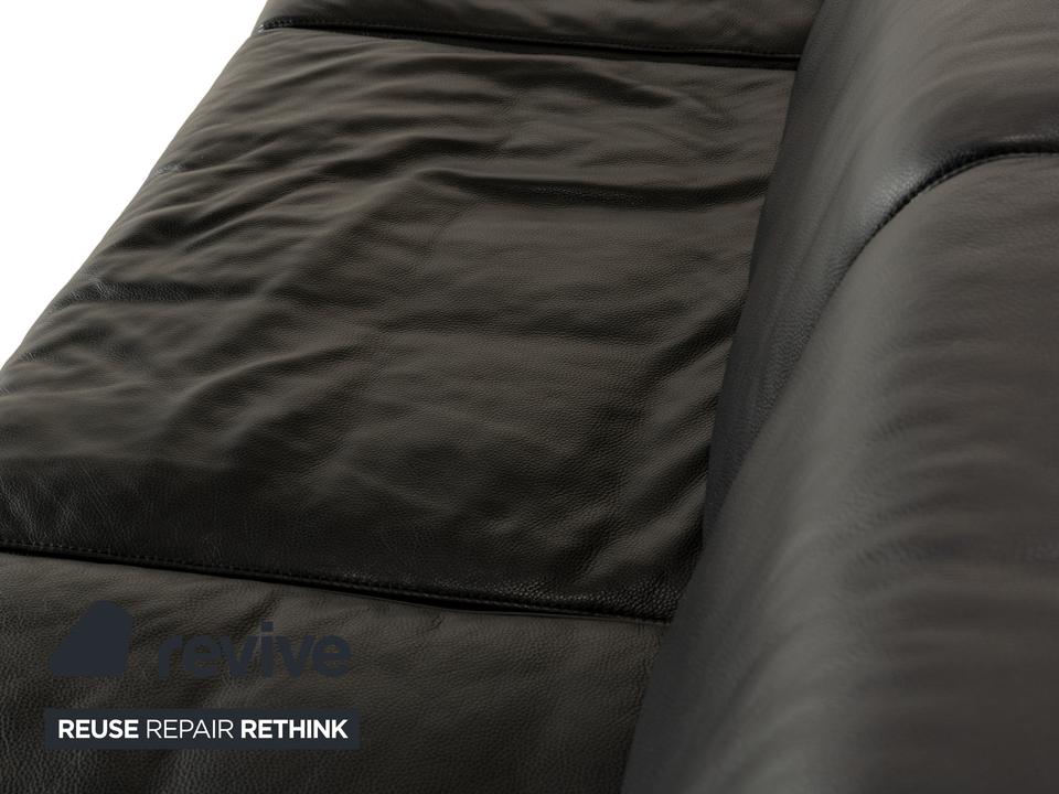 Das Sofa Alessiio von Ewald Schillig ist mit schwarzem Leder bezogen und steht auf schwarzen Holzfüßen. Es zeichnet sich durch sein unaufdringliches, klassisches Design aus, wodurch es leicht mit weiteren Einrichtungsgegenständen kombinierbar wird. Die tiefen Sitzflächen und großzügig gepolsterten Rückenlehnen versprechen hohen Komfort.