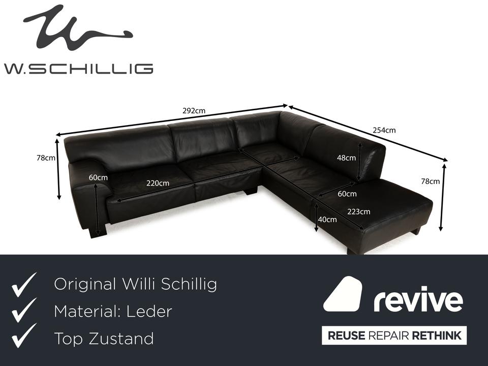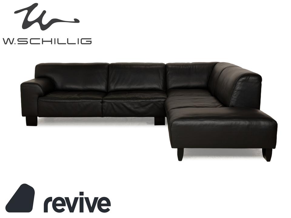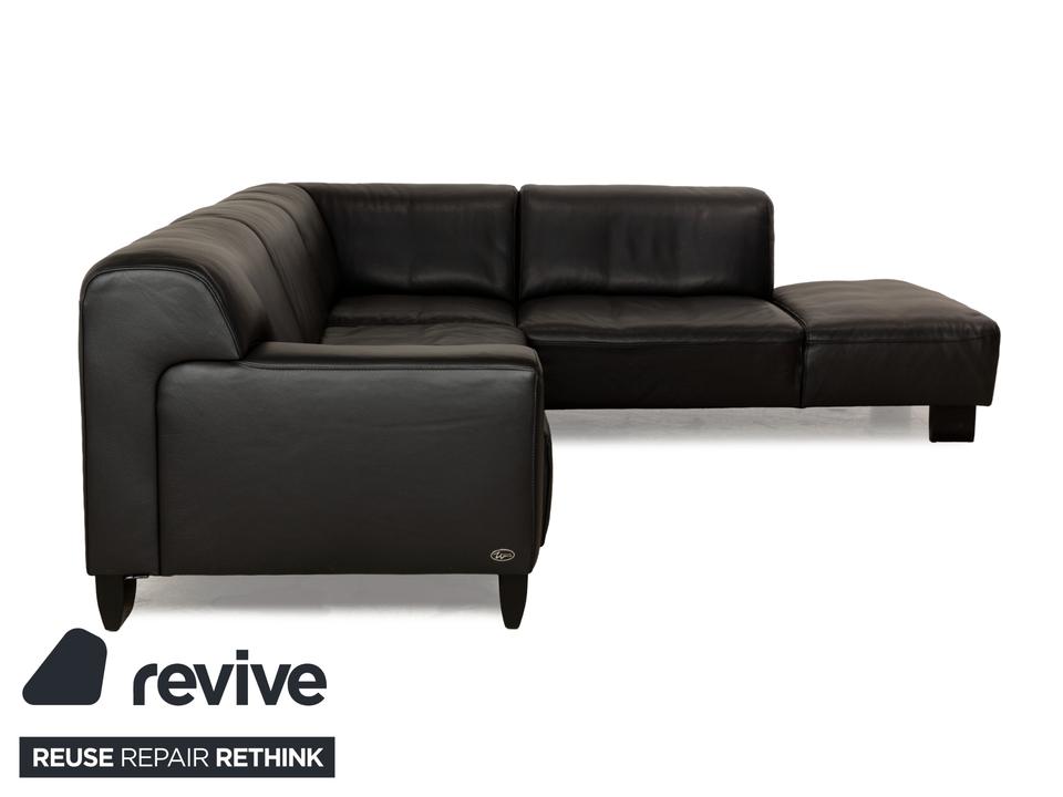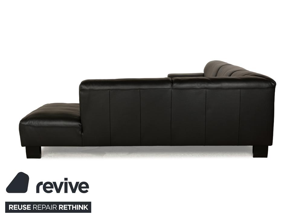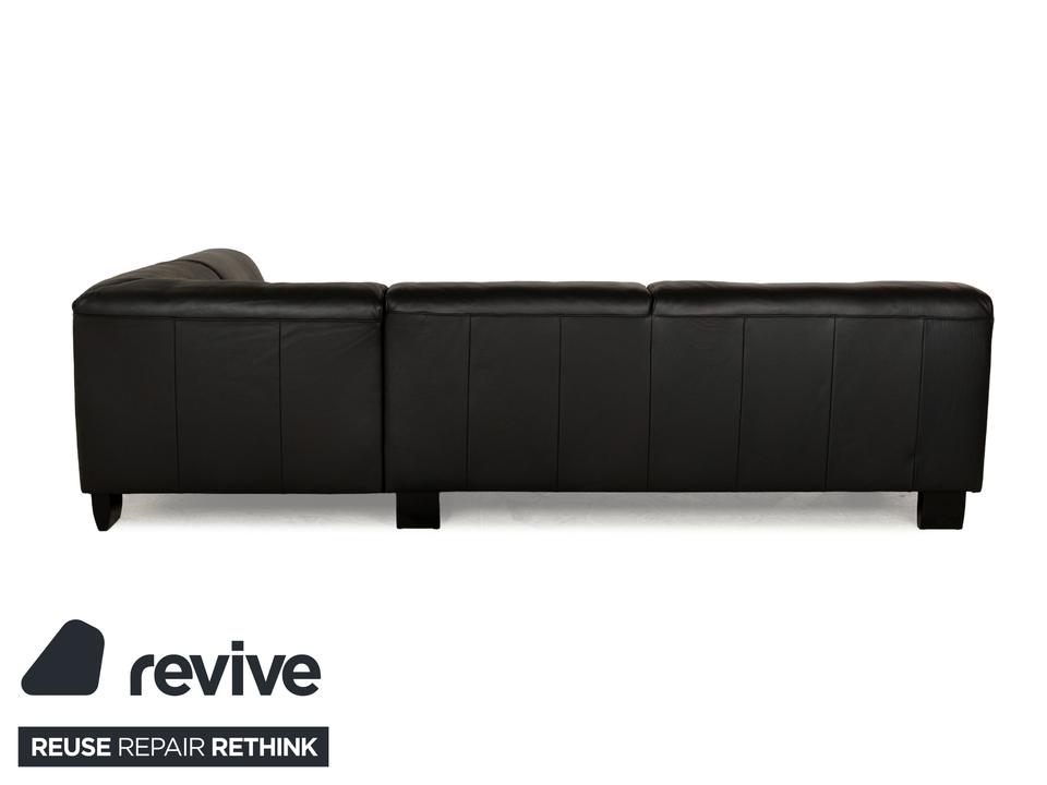 Das Sofa Alessiio von Ewald Schillig ist mit schwarzem Leder bezogen und steht auf schwarzen Holzfüßen. Es zeichnet sich durch sein unaufdringliches, klassisches Design aus, wodurch es leicht mit weiteren Einrichtungsgegenständen kombinierbar wird. Die tiefen Sitzflächen und großzügig gepolsterten Rückenlehnen versprechen hohen Komfort.