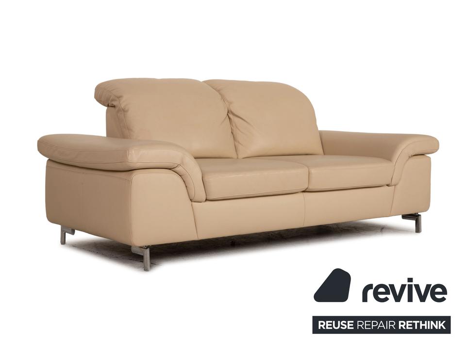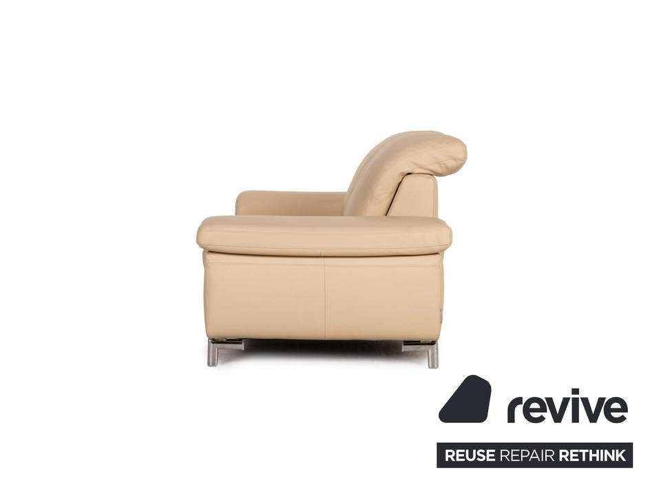 Das Willi Schillig Sofa ist mit einem cremefarbenen Echtleder bezogen und steht auf silbernen Metallfüßen. Das klassische Design und die abgerundeten Armlehnen zeichnen den Zweisitzer aus.