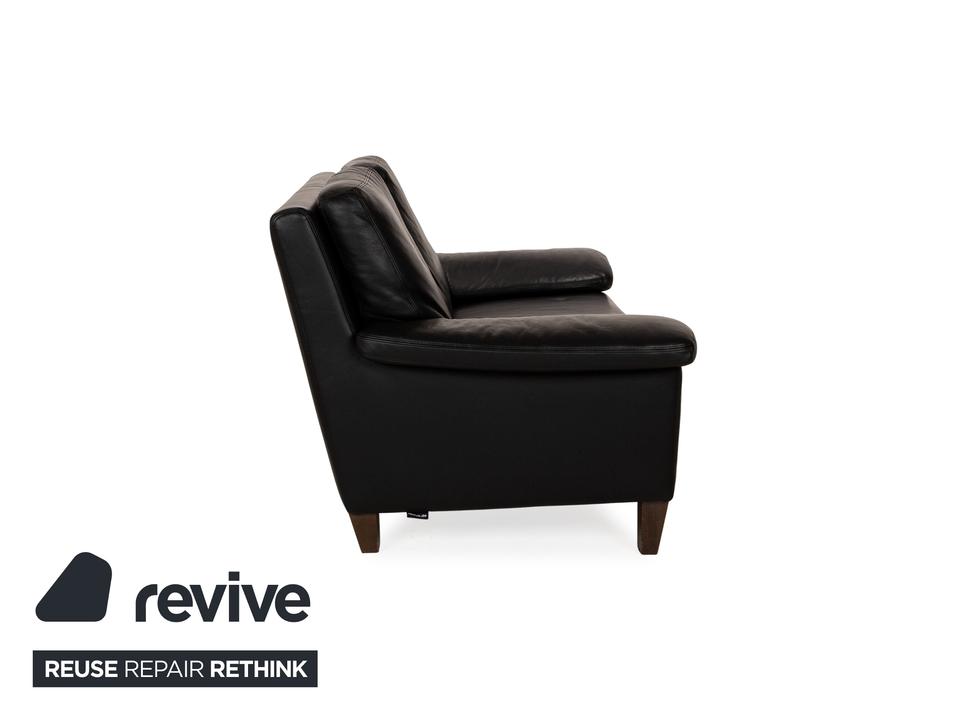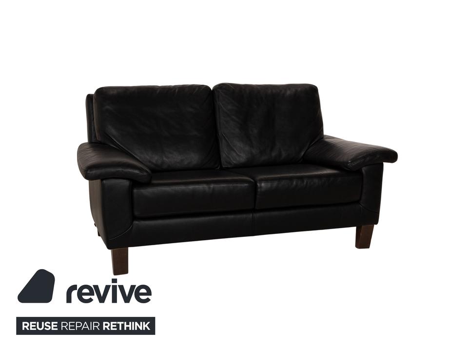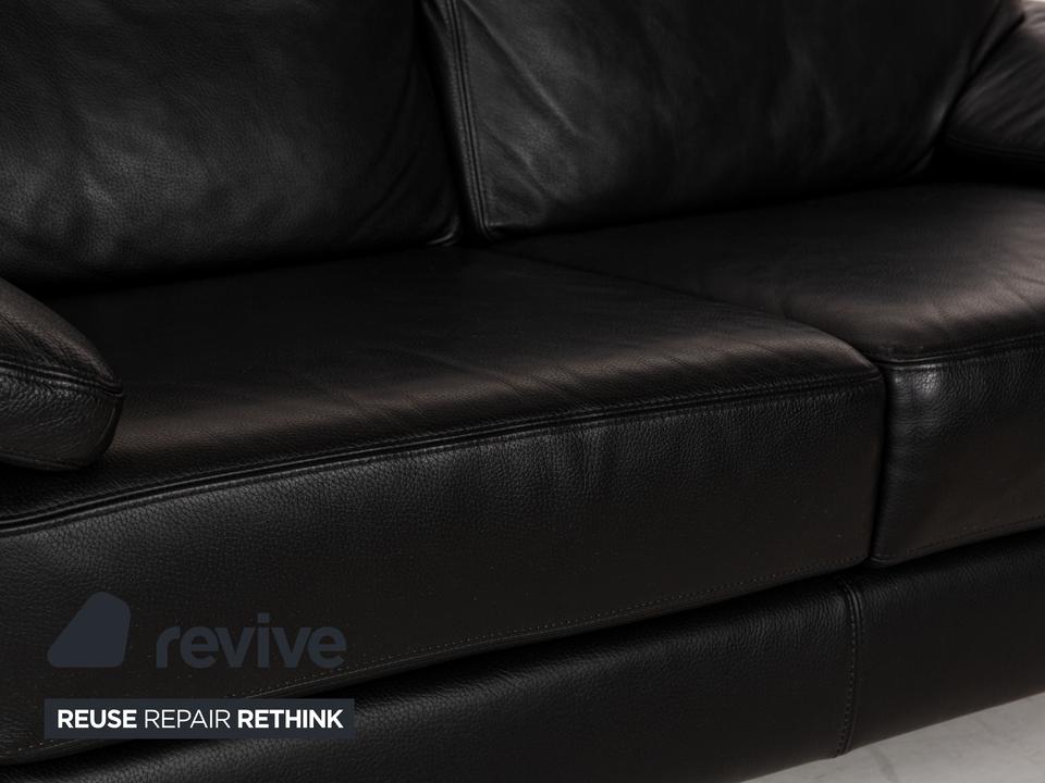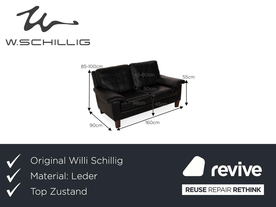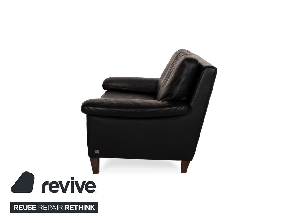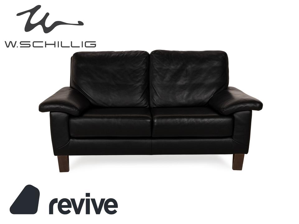 Das Sofa von Willi Schillig ist mit einem schwarzen Echtleder bezogen und steht auf unauffälligen Füßen. Das klassische, zeitlose Design zeichnet den Zweisitzer aus.