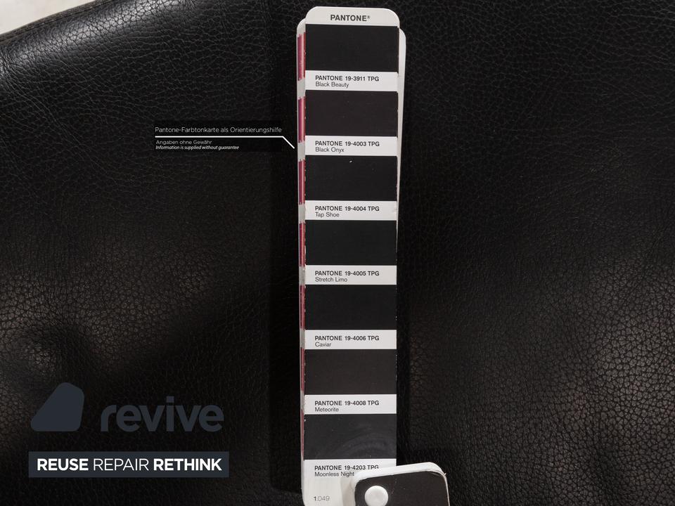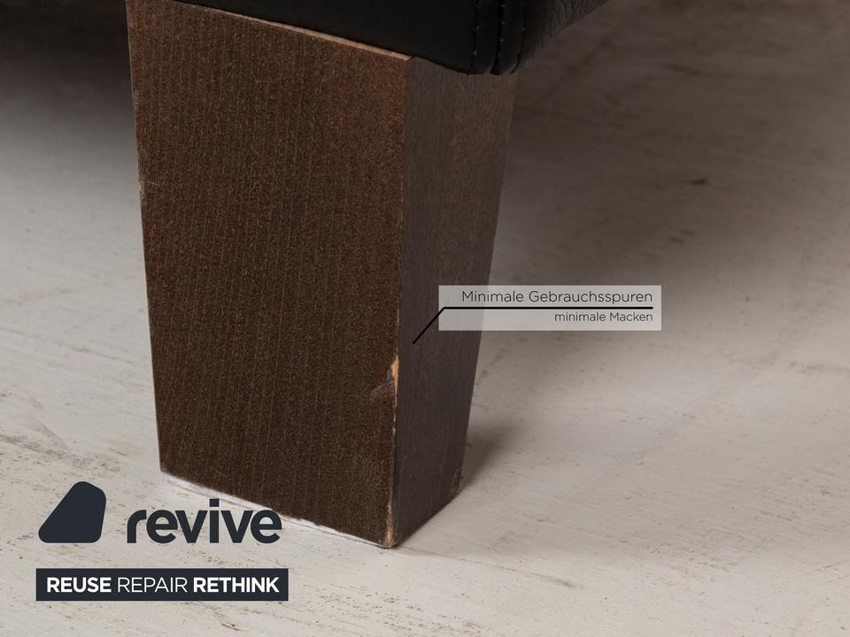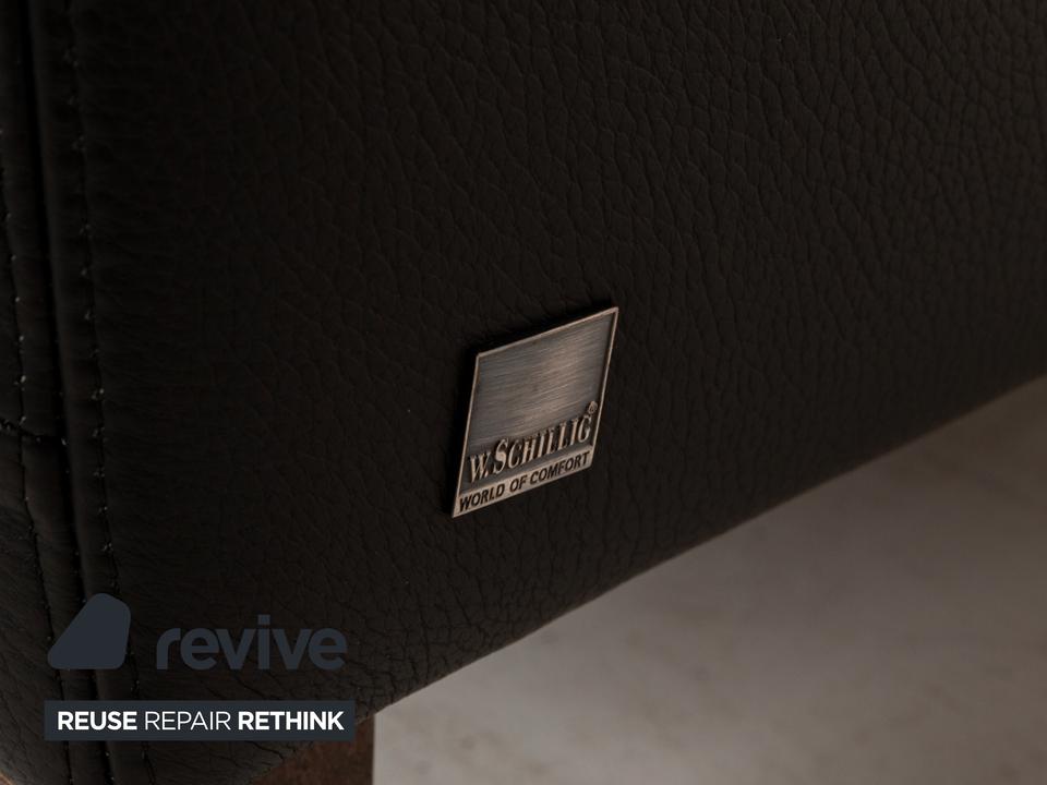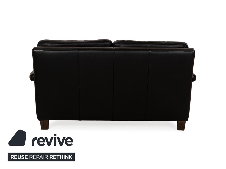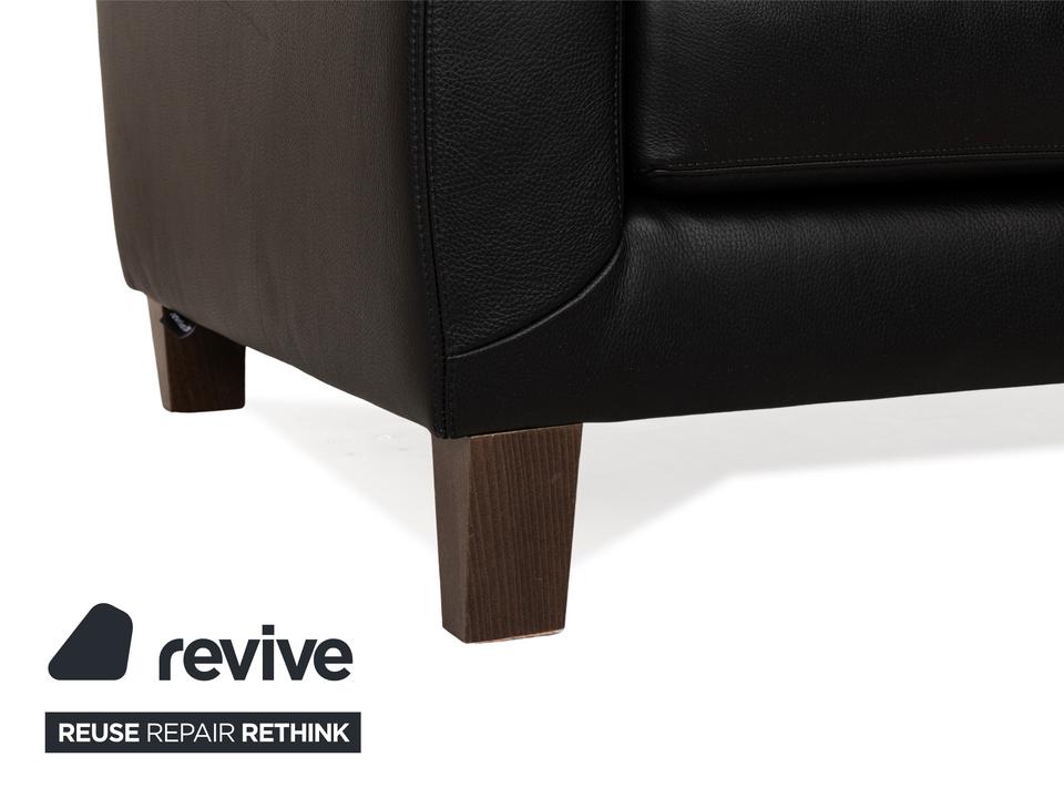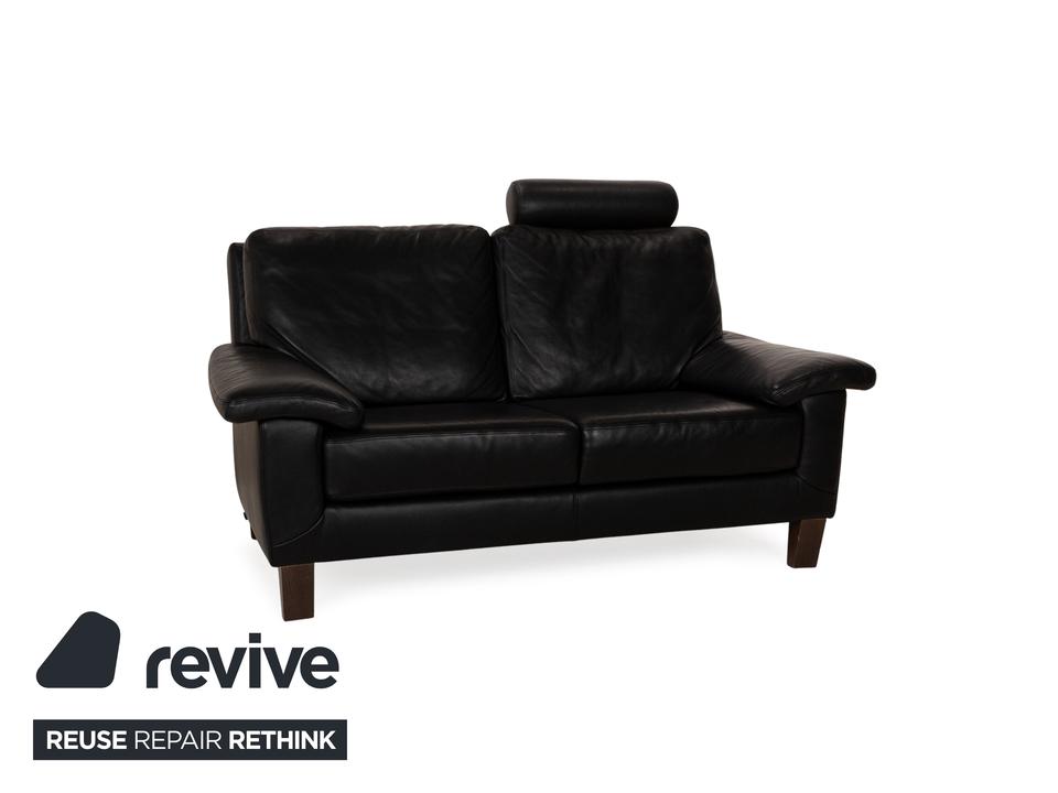 Das Sofa von Willi Schillig ist mit einem schwarzen Echtleder bezogen und steht auf unauffälligen Füßen. Das klassische, zeitlose Design zeichnet den Zweisitzer aus.