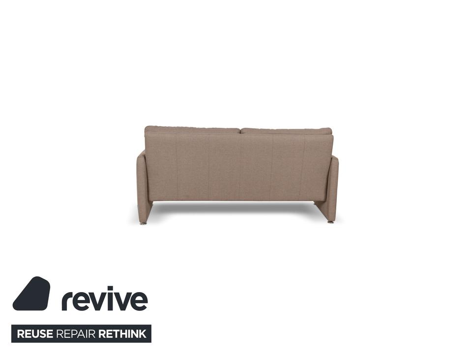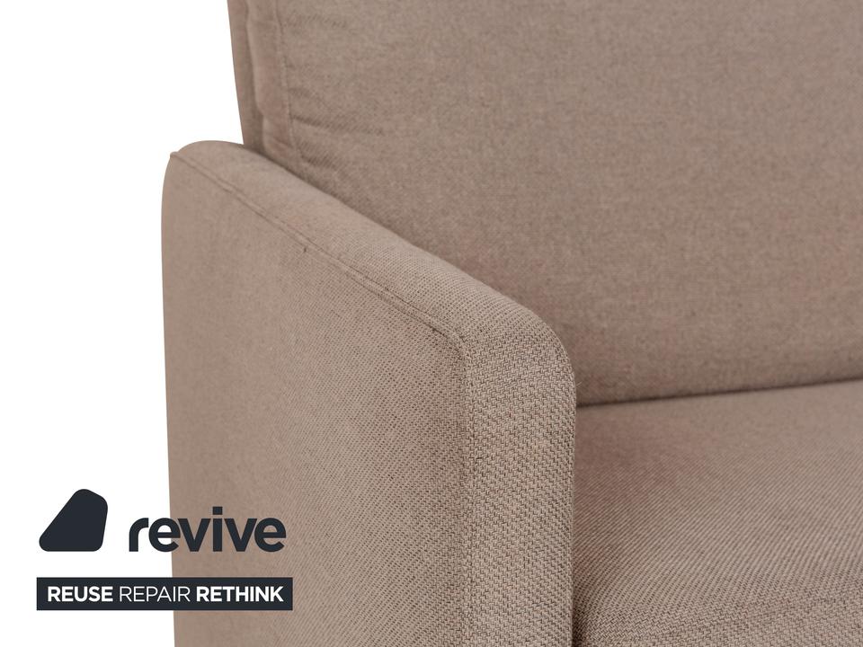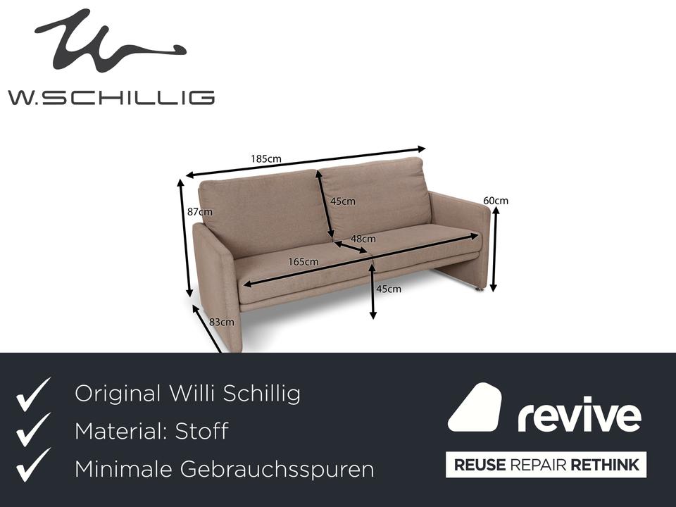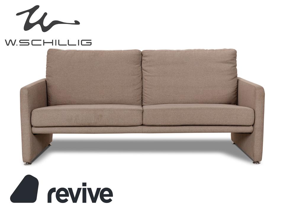 Das Sofa von Willi Schillig ist mit einem beigefarbenen Stoff bezogen und zeichnet sich durch sein reduziertes, schlichtes Design aus. Die bodentiefen Armlehnen des Dreisitzers sorgen für eine abgerundete Optik. Hohe Rückenlehnenpolster sorgen für Komfort.