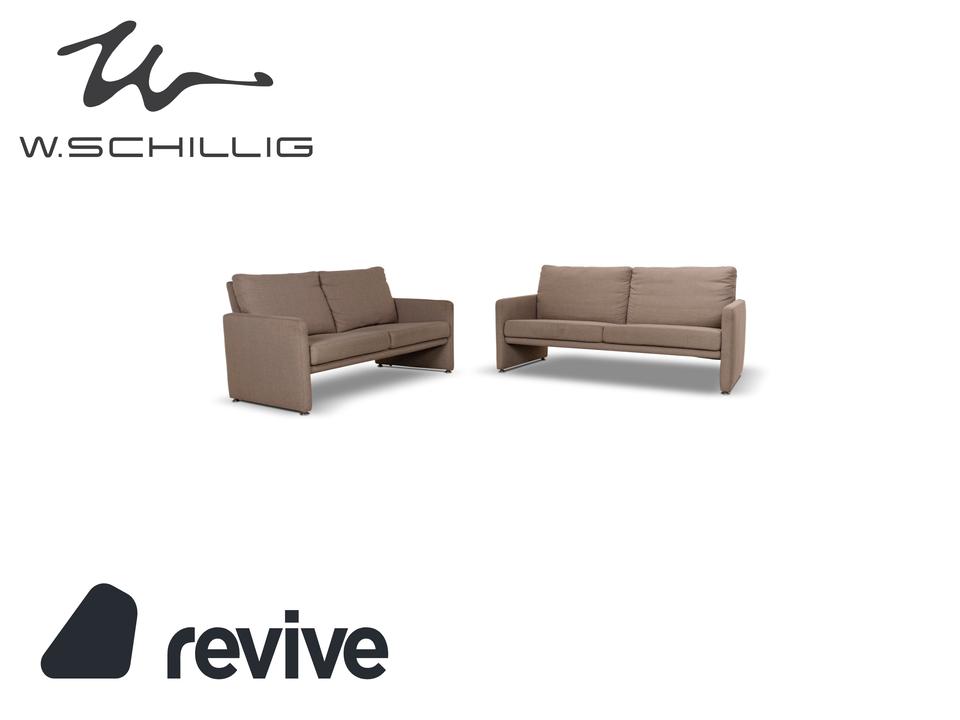 Die Sofa-Garnitur von Willi Schillig ist mit einem beigefarbenen Stoff bezogen und zeichnet sich durch sein reduziertes, schlichtes Design aus. Die bodentiefen Armlehnen des Sets, bestehend aus zwei Dreisitzern, sorgen für eine abgerundete Optik. Hohe Rückenlehnenpolster sorgen für Komfort.