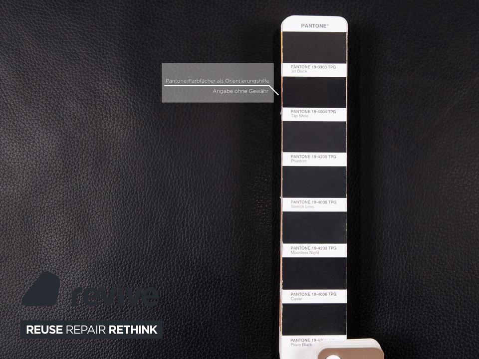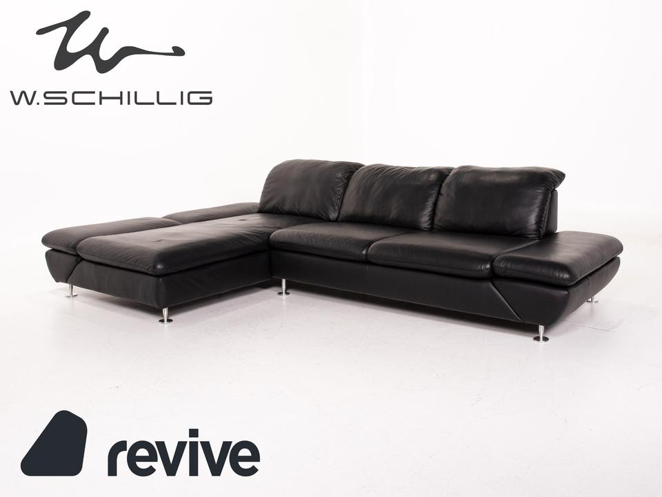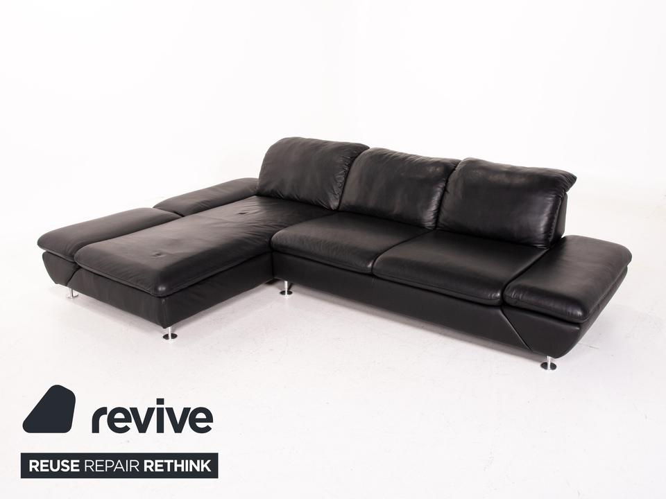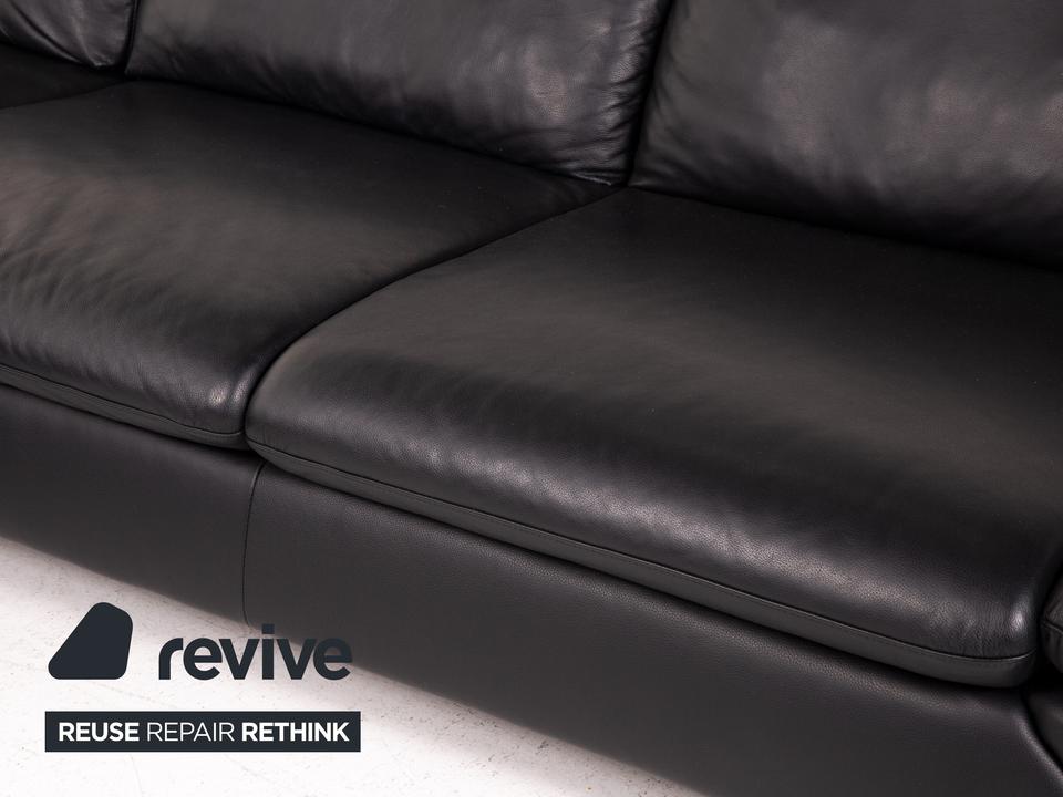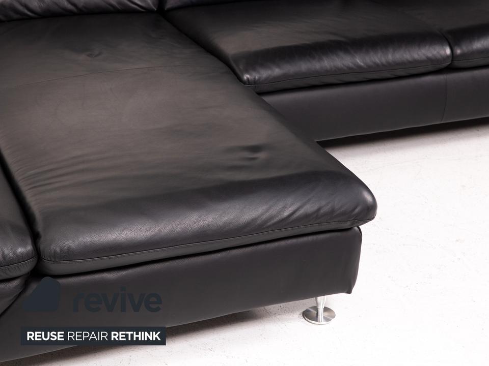 Das Ecksofa Taoo von Willi Schillig ist mit einem schwarzen Echtleder bezogen und steht auf schlanken Metallfüßen. Der Kopfbereich der Rückenlehnen kann nach hinten geneigt werden, Drei Armlehnen können hochgeklappt werden.