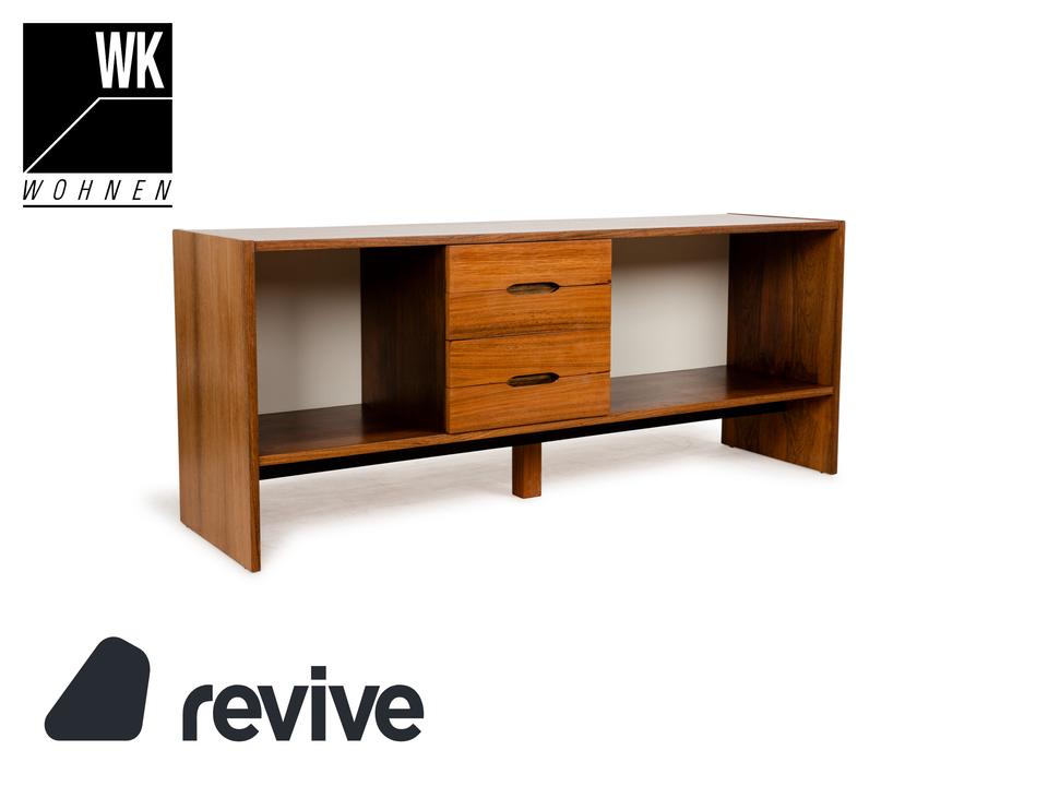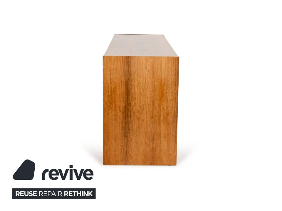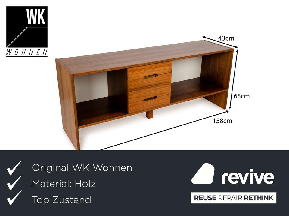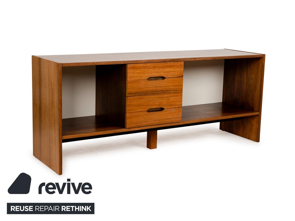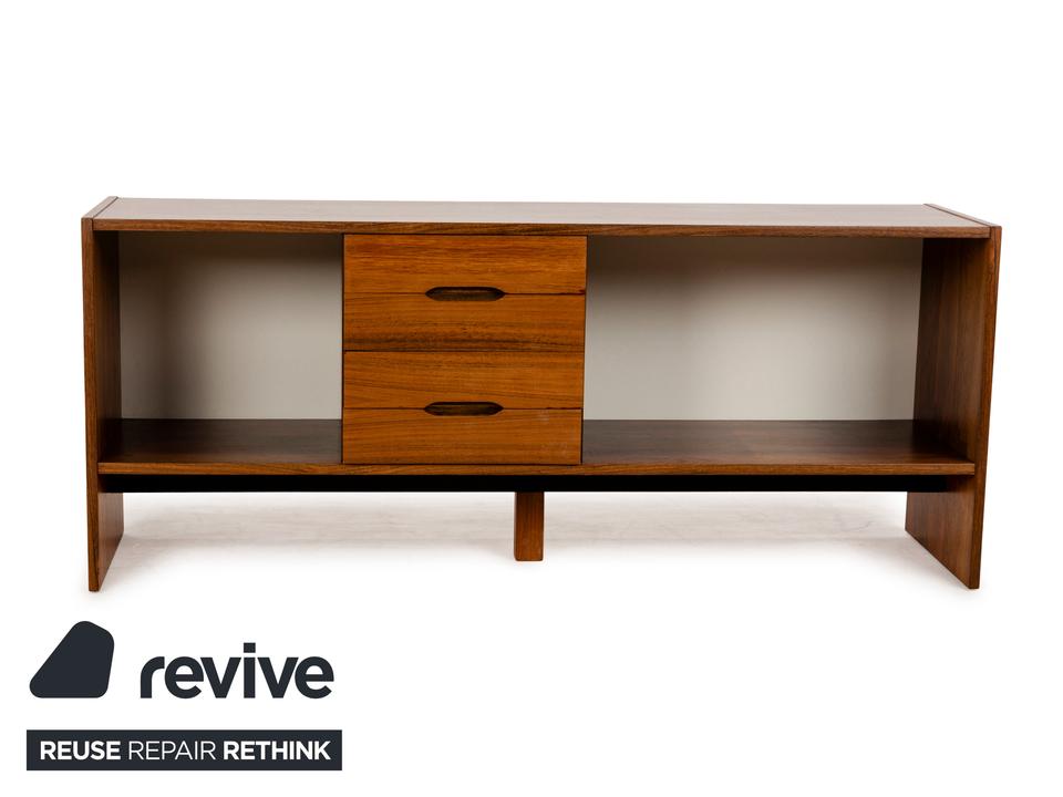 Das Sideboard von WOK Wohnen ist aus braunem Holz gefertigt und steht auf bodentiefen Seitenteilen. Es zeichnet sich durch sein klassisches und luftiges Design aus – zwischen zwei unterschiedlich großen, offenen Fächern sind vier Schubladen montiert. Der Cloud ist hierbei die Anordnung der Griffleisten.