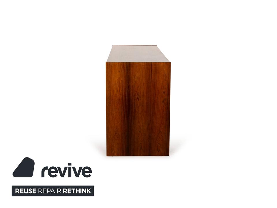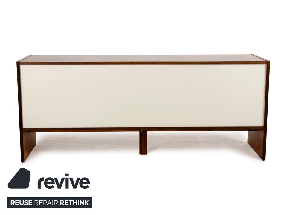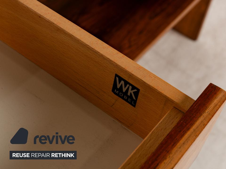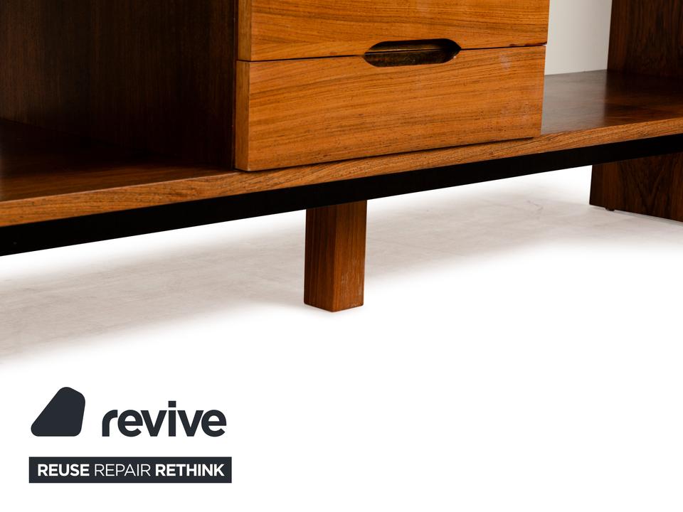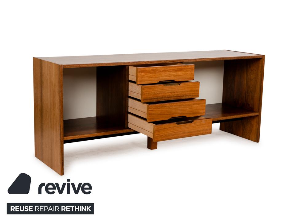 Das Sideboard von WOK Wohnen ist aus braunem Holz gefertigt und steht auf bodentiefen Seitenteilen. Es zeichnet sich durch sein klassisches und luftiges Design aus – zwischen zwei unterschiedlich großen, offenen Fächern sind vier Schubladen montiert. Der Cloud ist hierbei die Anordnung der Griffleisten.