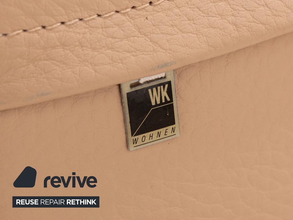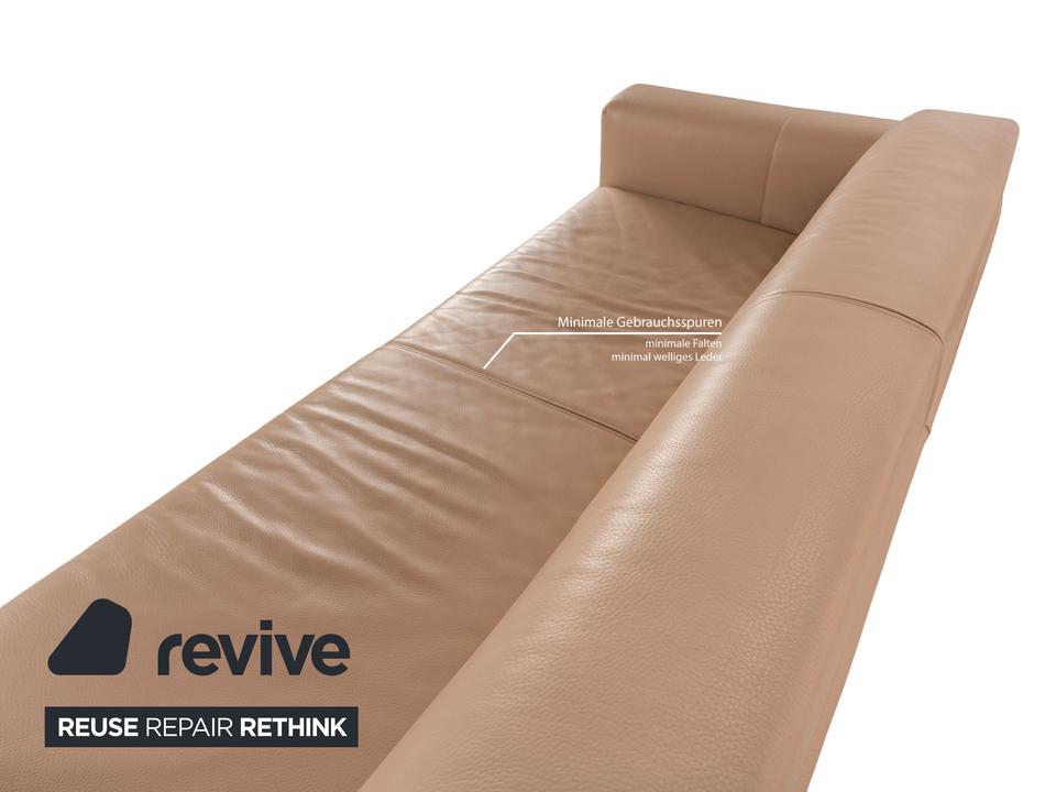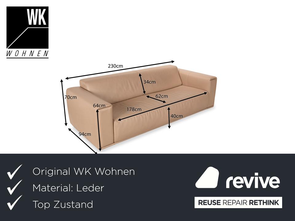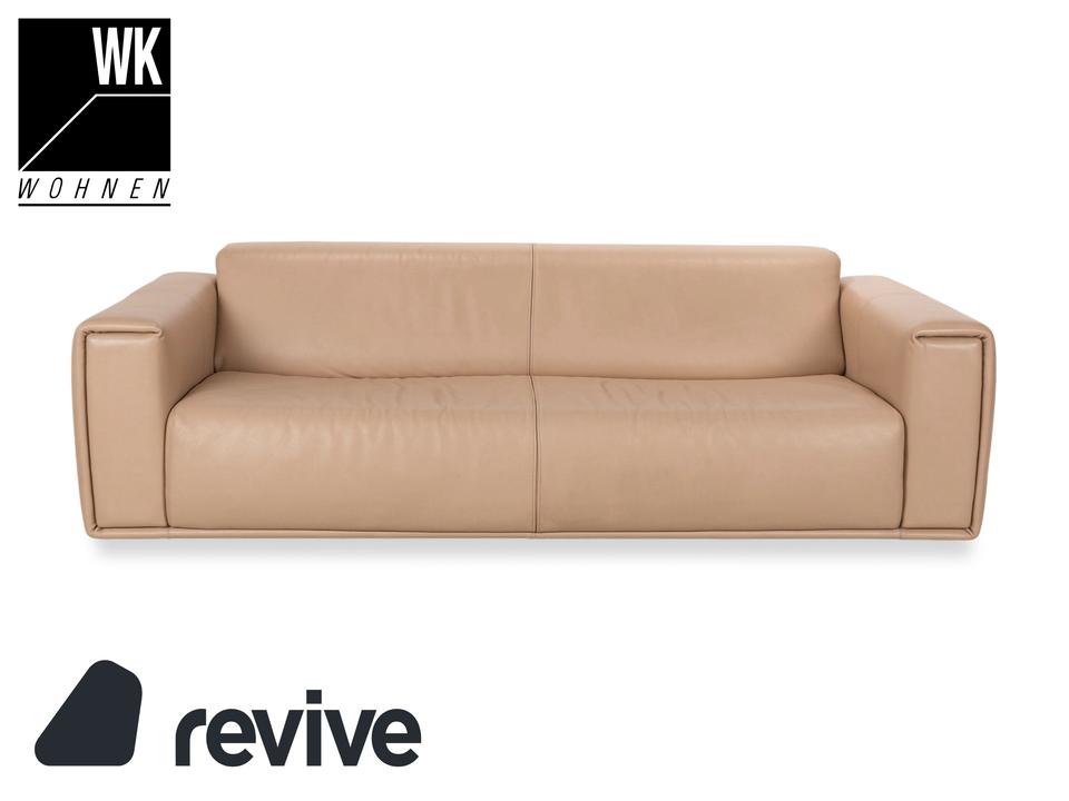 Der Dreisitzer von WK Wohnen ist mit einem beigen Echtleder bezogen und steht auf unauffälligen Füßen. Er zeichnet sich durch das schlichte, zeitlose Design und die klassische Optik aus.