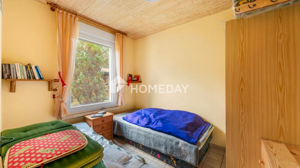 Das Schlafzimmer liegt ruhig zum Garten hin und sorgt für erholsame Nächte. Das Tageslichtbad mit Dusche ist gepflegt und funktional gestaltet. Die gesamte Fläche ist gefliest, was das Haus pflegeleicht und robust macht.
