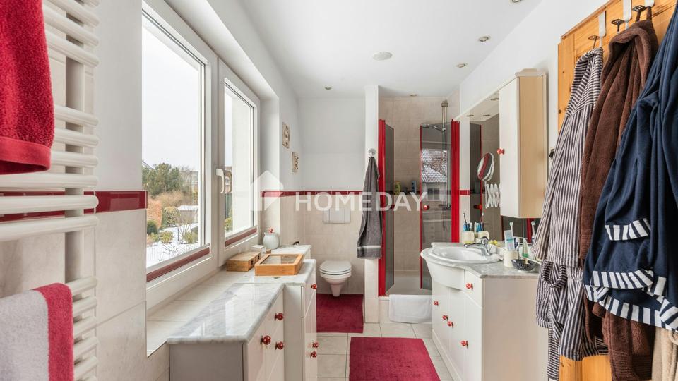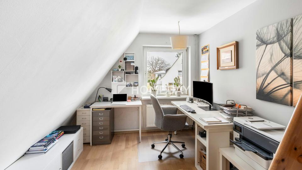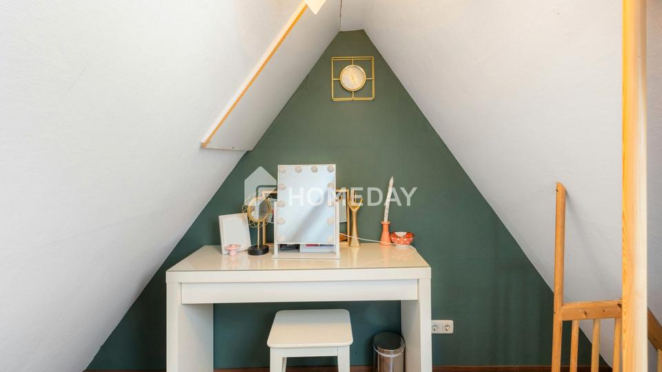 Das Dachgeschoss bietet mehrere Rückzugsräume und unterstreicht den familienfreundlichen Charakter des Hauses. Neben dem Elternschlafzimmer mit zugeordnetem Badezimmer, das sowohl mit Dusche als auch mit Badewanne ausgestattet ist, stehen weitere Zimmer zur Verfügung. Insgesamt sind drei Schlafzimmer vorhanden, darunter ein Kinderzimmer, das direkt unter dem Dach eingerichtet ist und durch seine Lage einen besonderen, abgeschirmten Rückzugsraum bietet. Die Raumaufteilung wirkt insgesamt klar strukturiert und funktional, ohne dabei an Wohnlichkeit einzubüßen. %BREAK%