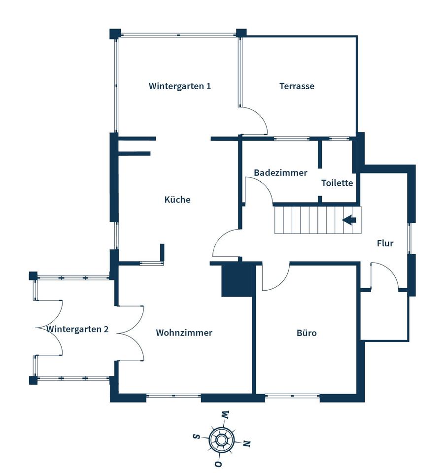 Im Erdgeschoss liegt der zentrale Wohnbereich des Hauses. Das Wohnzimmer bildet einen angenehmen Mittelpunkt und ist direkt an einen Wintergarten angeschlossen, der nach Süden ausgerichtet ist und besonders zur Mittagszeit von viel Tageslicht profitiert. Hier entsteht ein offenes, helles Raumgefühl, das den Wohnbereich erweitert und den Blick ins Grüne freigibt. Die Küche ist mit einer Einbauküche ausgestattet und ebenfalls direkt mit einem Wintergarten verbunden. Dieser zweite Wintergarten ist nach Westen orientiert und fängt die Abendsonne ein – ein ruhiger Ort, der sich gut für entspannte Stunden oder einen Rückzug am Tagesende eignet. Ergänzt wird das Erdgeschoss durch ein weiteres Zimmer, das flexibel als Büro, Gästezimmer oder Hobbyraum genutzt werden kann, sowie ein Badezimmer mit Dusche.