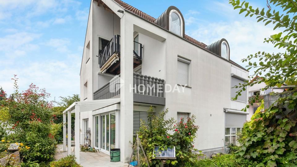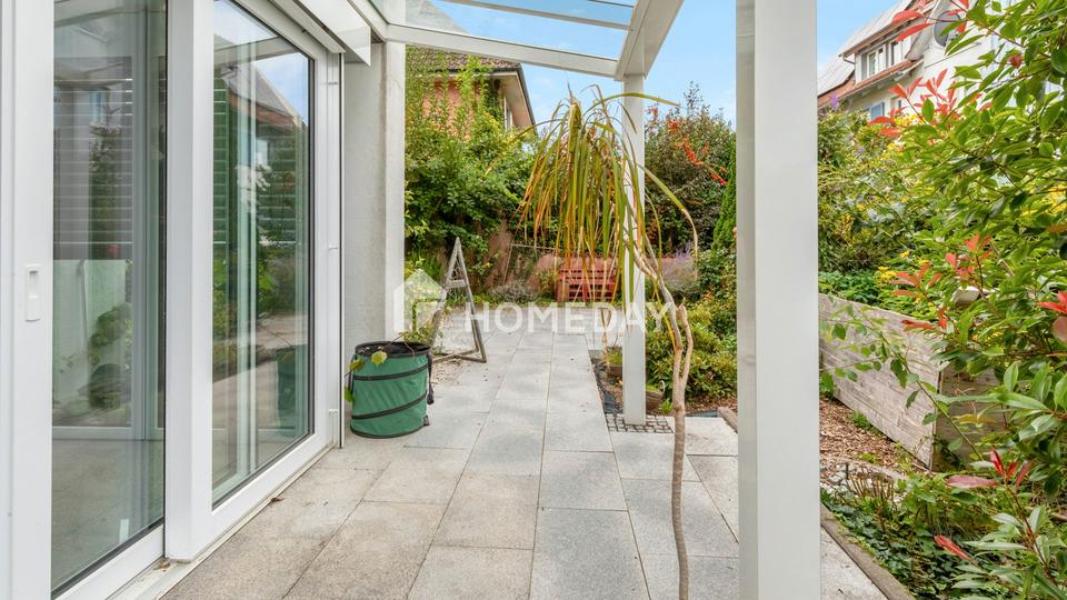 Das Herzstück der Wohnung ist das geräumige Wohn- und Esszimmer, das durch große Fensterflächen und den angrenzenden Wintergarten eine angenehme Helligkeit erhält. Die offen gestaltete Küche ist harmonisch in den Wohnbereich eingebunden und schafft eine einladende Atmosphäre für gesellige Abende und familiäres Miteinander. Vom Wohnraum aus gelangt man direkt auf die sonnige, teils überdachte Terrasse, die von einem üppigen Gartenbereich umgeben ist – ein ruhiger Rückzugsort mit Teilseesicht. Für beides gibt es ein exklusives Sondernutzungsrecht.