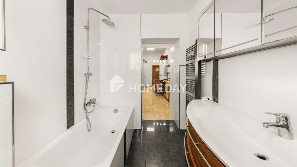 Das Badezimmer ist funktional ausgestattet und verfügt über Badewanne, Bidet, Handtuchwärmer sowie ein Fenster, was für angenehmes Tageslicht und gute Belüftung sorgt. Ferner steht Ihnen ein Gäste-WC zur Verfügung.