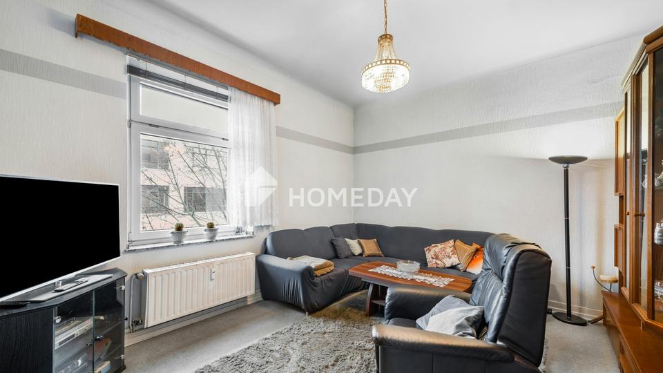 Vom zentralen Flur aus erschließen sich alle Zimmer separat. Das Wohnzimmer überzeugt durch seinen klassischen Schnitt und bietet ausreichend Platz für eine komfortable Wohnlandschaft. Die Fenster sorgen für eine gute Belichtung und unterstreichen die luftige Raumwirkung.