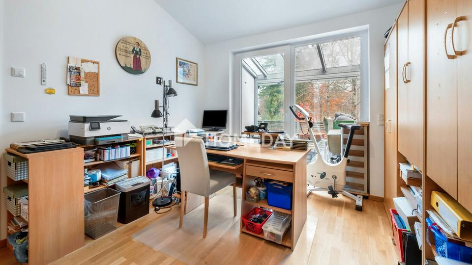 Das Wohnzimmer besticht durch seine klare Linienführung und eine angenehme Lichtstimmung durch bodentiefe Fenster. Es bietet ausreichend Platz für eine Wohnlandschaft, während der offene Küchenbereich mit einer Einbauküche samt Markengeräten im modernen Stil überzeugt. Besonders hervorzuheben ist der helle Wintergarten der sich an das Wohnzimmer anschließt. Dieser Rückzugsort bietet zusätzlichen Platz, geschützten Aufenthalt im Grünen und werten das Wohngefühl merklich auf – unabhängig von Wetter und Jahreszeit.