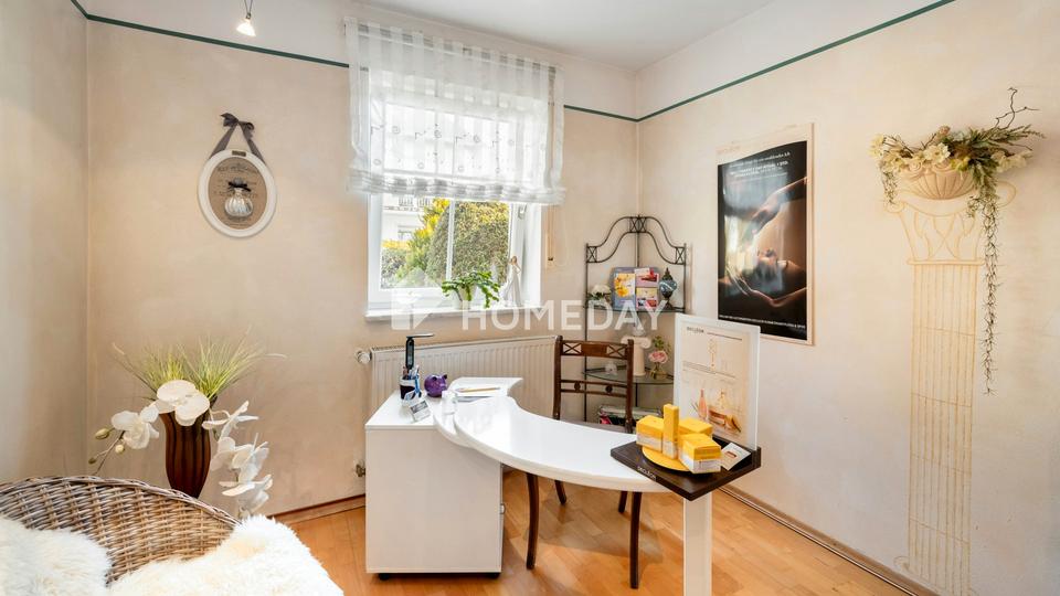 Im Untergeschoss befindet sich eine kleine Gewerbefläche von ca. 40 Quadratmetern, die seit 29 Jahren als Kosmetik- und Fußpflegepraxis genutzt wird. Die Praxis kann bei Bedarf inklusive Kundenstamm übernommen werden.