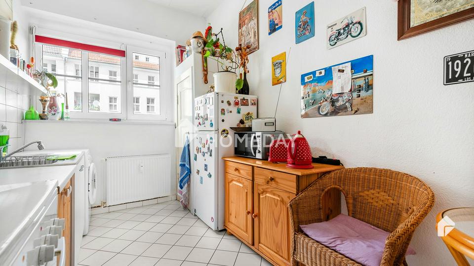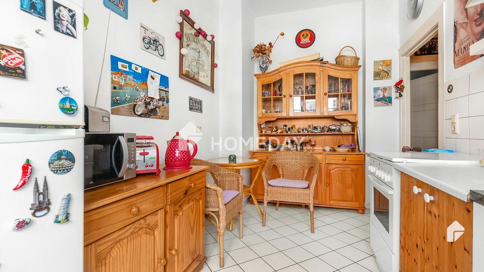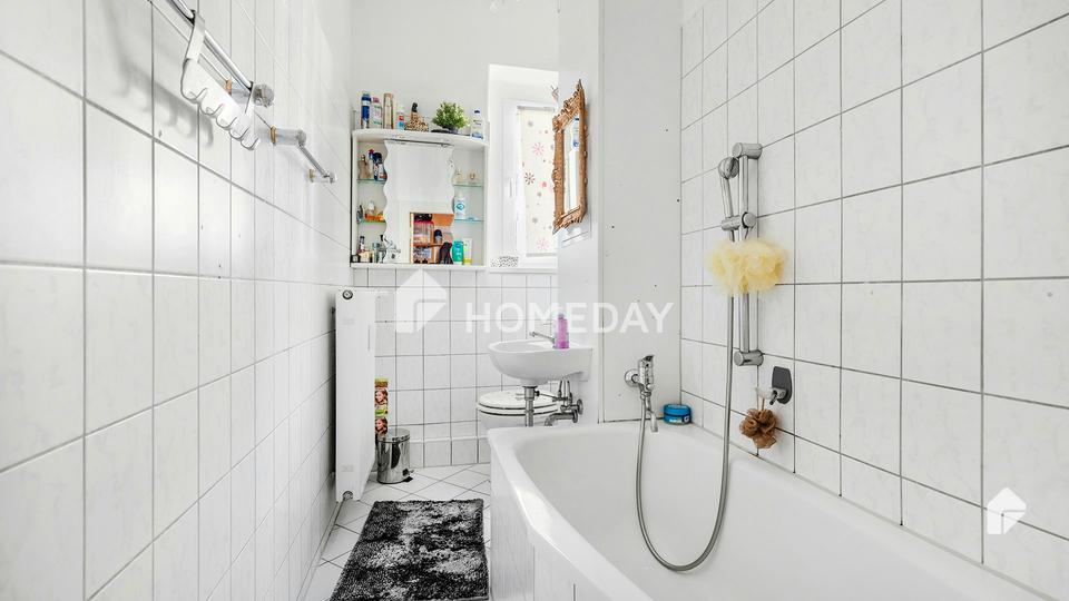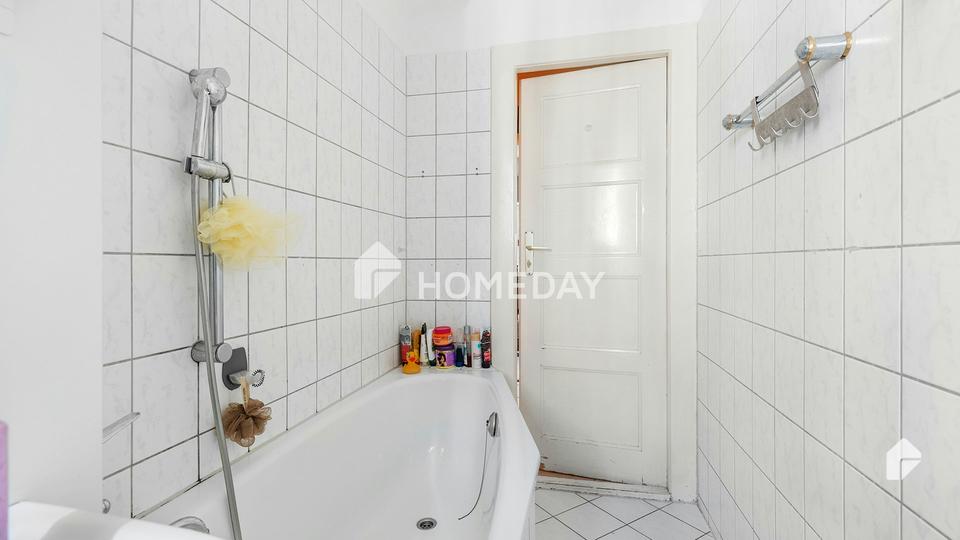 Die Küche, ausgestattet mit einem E-Herd und einer Küchenspüle, bietet genügend Platz für einen gemütlichen Frühstückstisch für zwei Personen. Zudem verfügt sie über einen praktischen Waschmaschinenanschluss und ein Fenster, das für viel Tageslicht sorgt. Das weiß geflieste Tageslichtbad befindet sich in einem gepflegten Zustand und besticht durch eine einladende Badewanne.