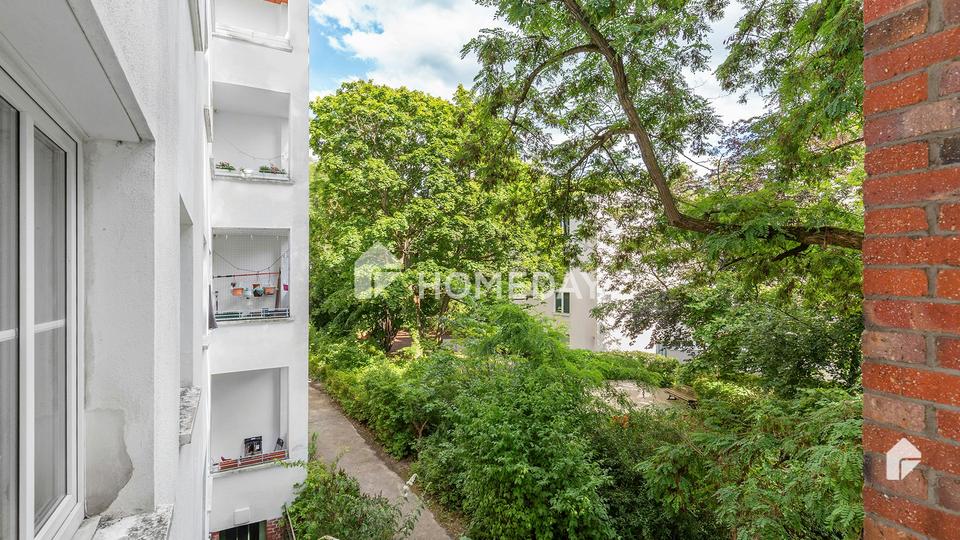 Die helle Etagenwohnung mit zweieinhalb Zimmern und einer Wohnfläche von ca. 69,42 Quadratmetern befindet sich in zentraler Lage, unmittelbar in der Nähe des Weißen Sees. Die Wohnung ist über das gemeinschaftlich genutzte Treppenhaus erreichbar und liegt im ersten Obergeschoss.